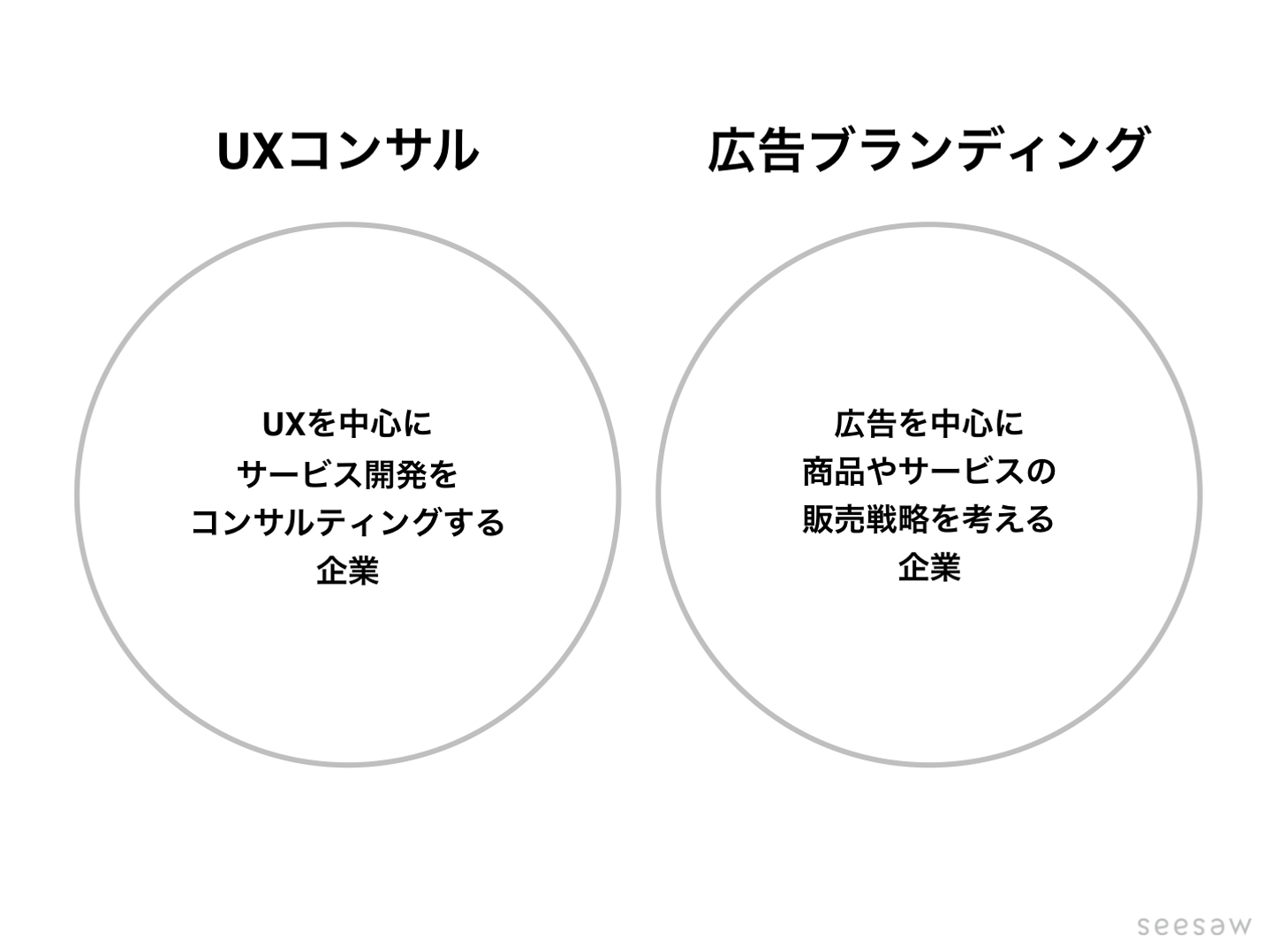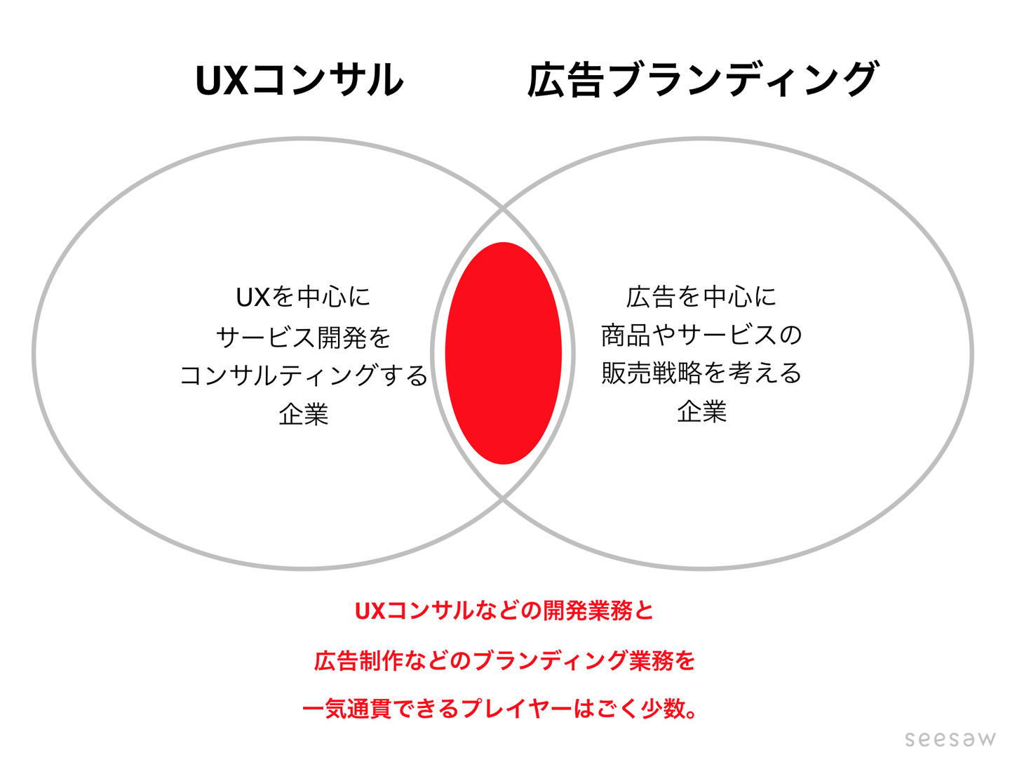 SEESAWが着目し実践しているのは「デザイン×コンサルティング」。具体的には広告デザイン(ブランディング)とUXコンサルティングの掛け合わせです。