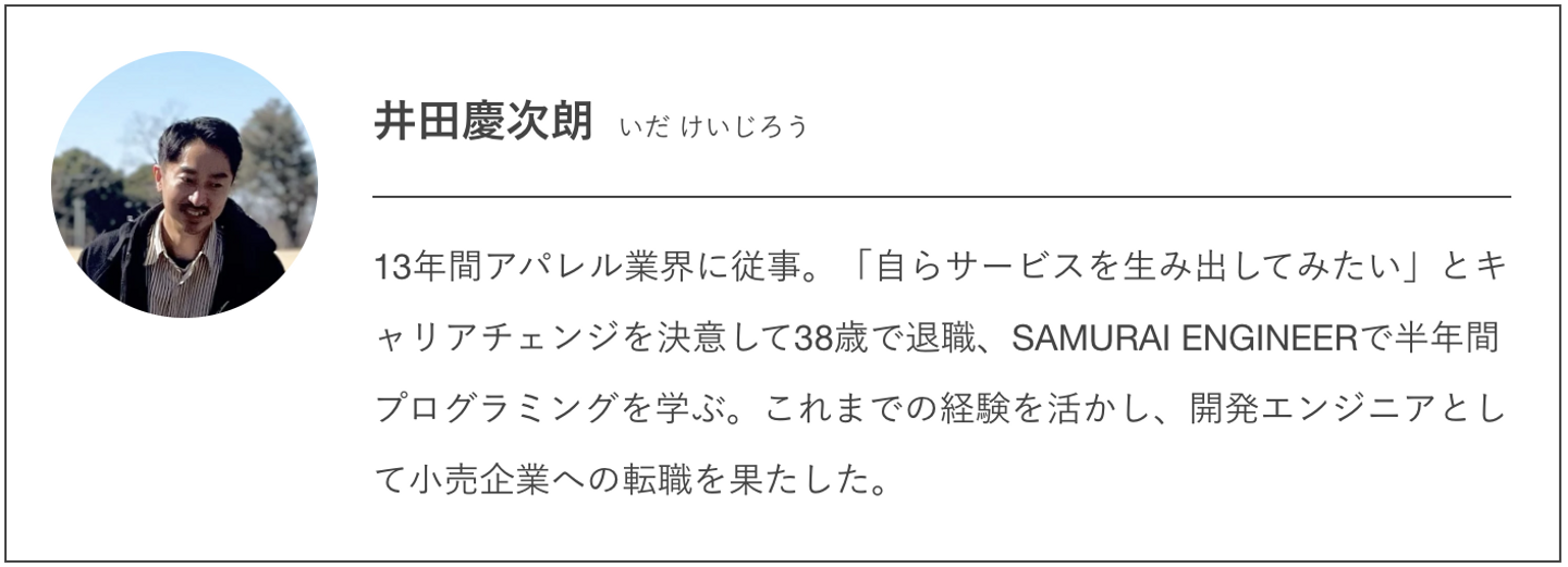 今回は卒業生の井田さんに、SAMURAI ENGINEERとの出会いから卒業後のキャリアについてたっぷり語ってもらいました。