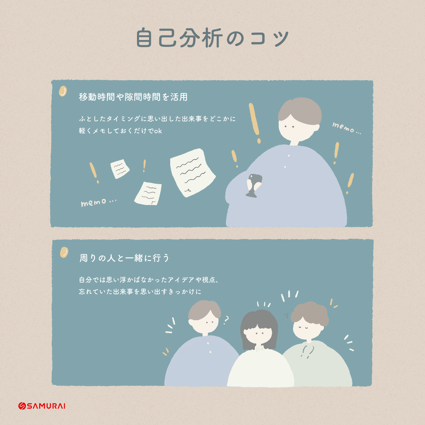 自己分析とは、今までの経験の中で感情が動いた瞬間を振り返り、自分自身の「価値観」「行動の傾向」「強み・弱み」などを把握すること。幼少期や学生時代にどのような経験をしたのか、将来どんな自分になりたいのかを明確にすることで、自分自身にマッチする企業を見つけやすくなります。