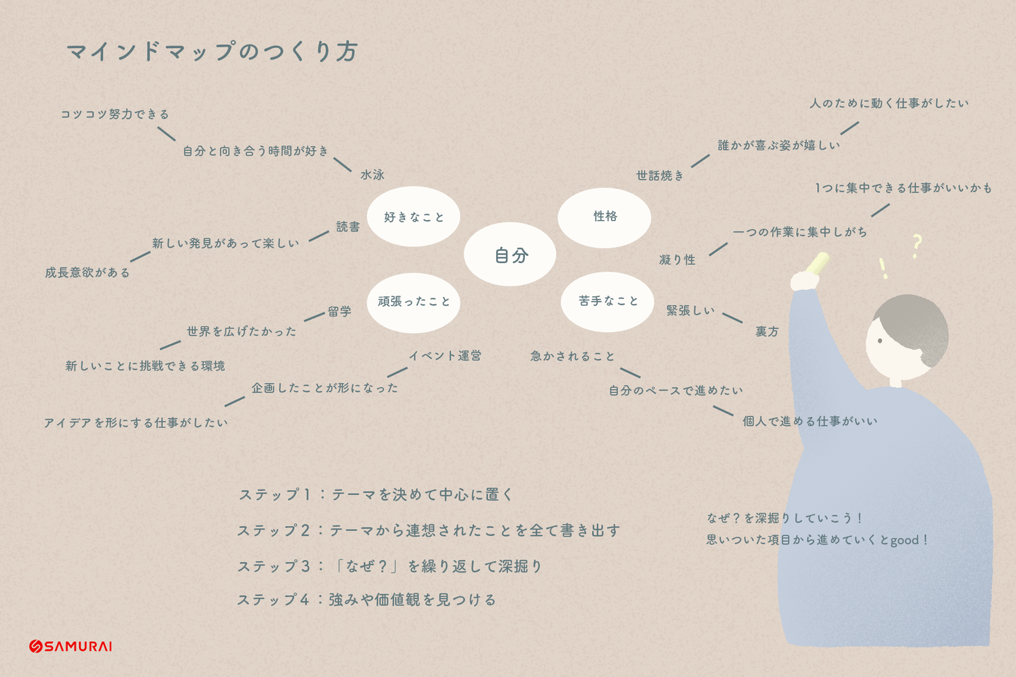 前編は自己分析の中で一番手軽にできる「マインドマップ」のつくり方をご紹介!ぜひ、参考にしてみてくださいね!