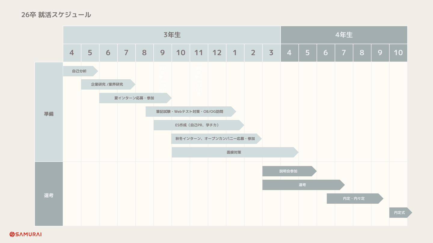 サマーインターンに参加する企業や気になる業界を絞り込むためにも、就活を本格始動する前の大学2年生・3月までに終わらせておくのがベスト!できるだけ早めに終わらせることで目指すべき業界を絞ることができ、企業研究をする時間も増えますよ◎