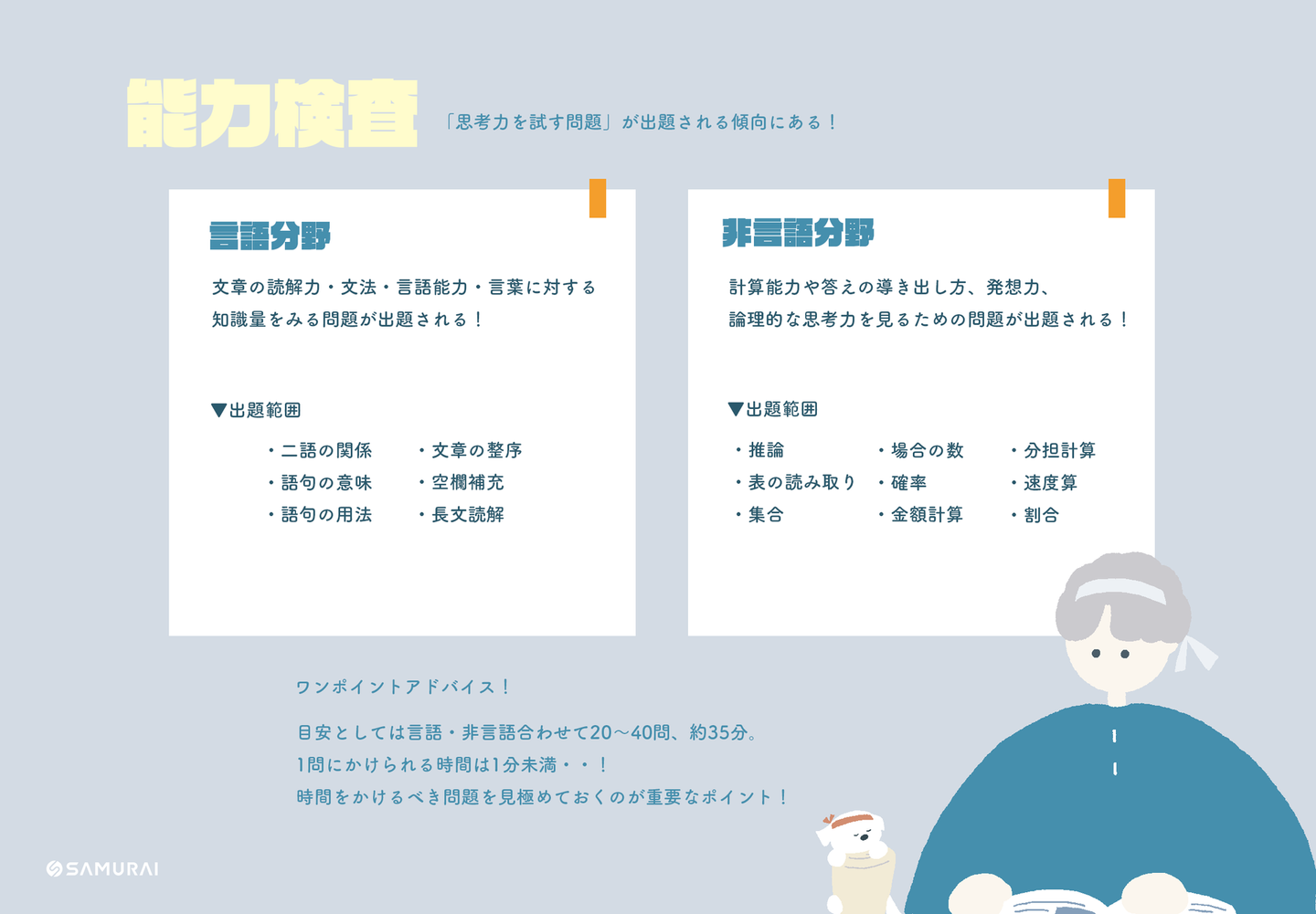 能力検査は大きく「言語分野」&「非言語分野」に分けられます。国語力や算数・数学力を測る問題よりも「思考力を試す問題」が出題される傾向に。そのため考え方(解き方)と時間配分がカギとなります。