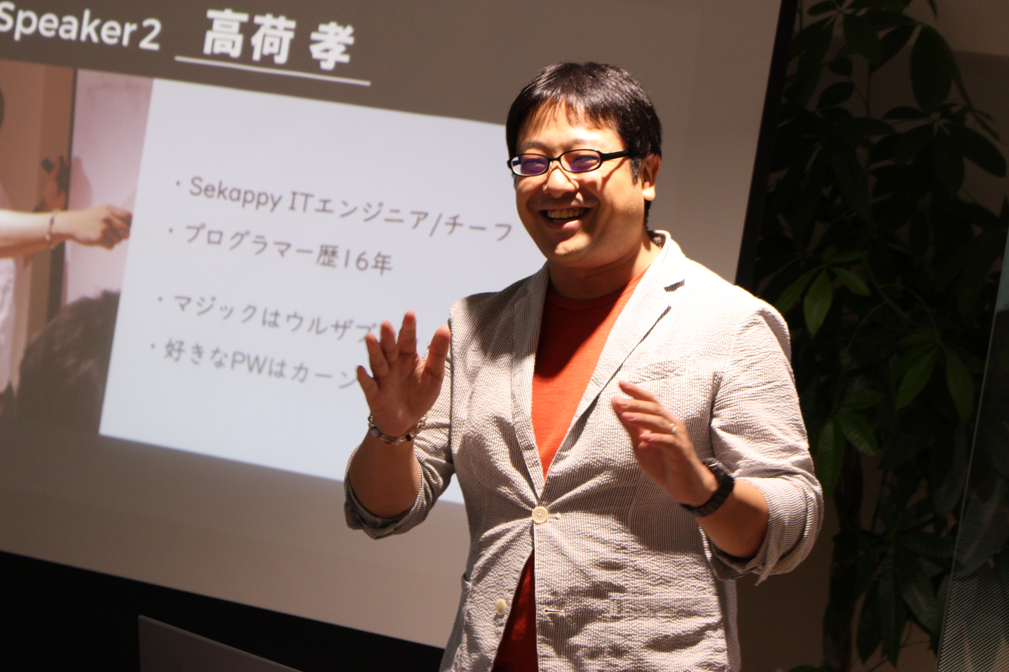 佐藤からの会社紹介が終わると、今度はSekappyエンジニアの高荷にバトンタッチ。高荷孝からはSekappyでのお仕事でマジックの経験が活きた事例とマジックで磨かれるエンジニアの力というテーマでお話をさせていただきました。