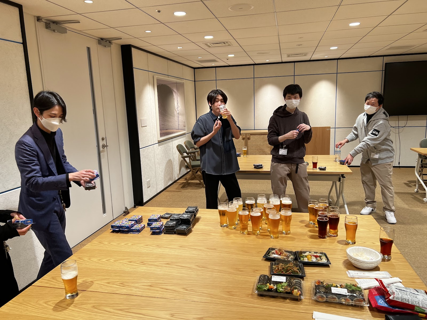 業務終了後の19時30分になると、ビールを片手にWeWork 渋谷スクランブルスクエアの会議室に続々と参加者が集まってきます。(ビールは渋谷スクランブルスクエアで無料で飲むことができます!)