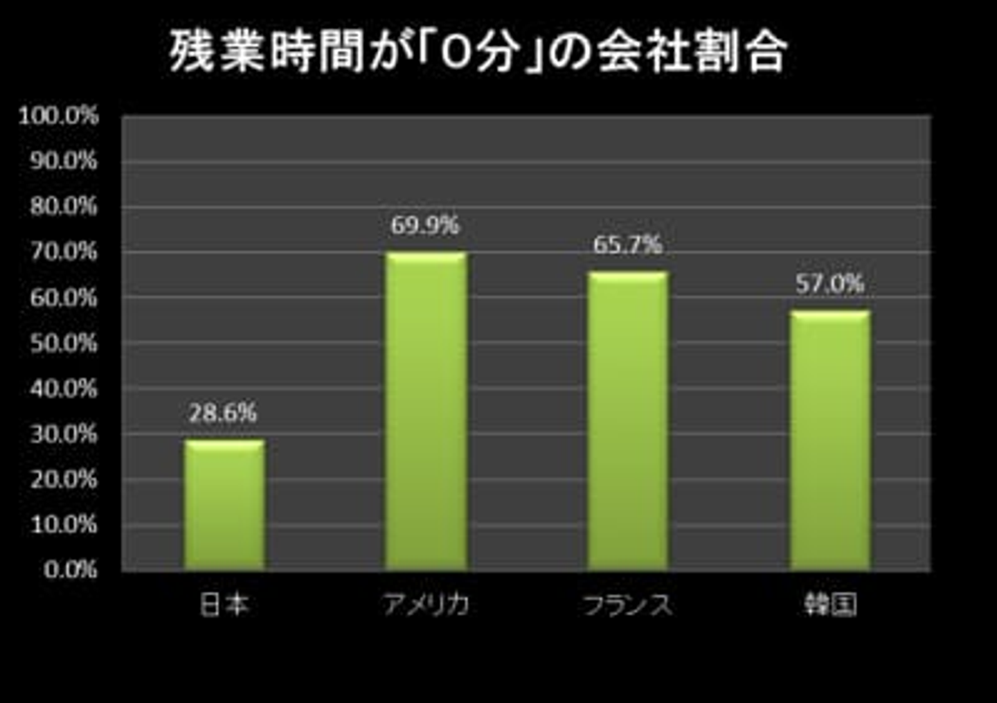 雇用契約では原則として就業時間が定められています。会社は当然その時間だけ働くことを要求し、従業員はそれに応えます。しかし一般的には定時で帰ることはないでしょう。連合総研が2009年に調査したデータでは、残業させていることを隠したいはずの企業側の回答でも「まったく残業しない(残業時間が0分)」としている会社の割合は28.6%だけです。一方、アメリカやフランス、韓国などでは過半数の会社で残業が0分です。