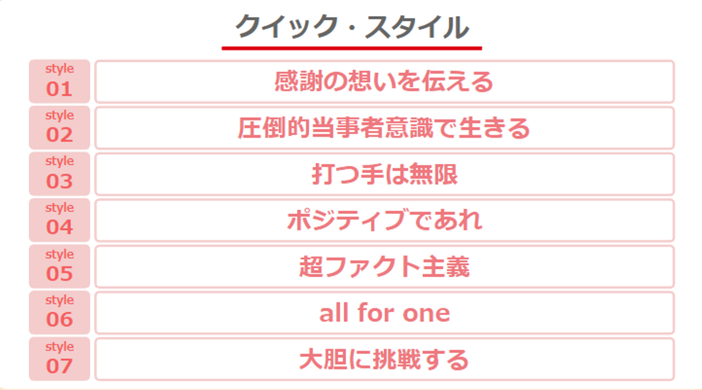 このクイック・スタイルを行動指針として行動し、仕事の時間を充実した良い時間にして、豊かな人生を送ってほしいと思っています。