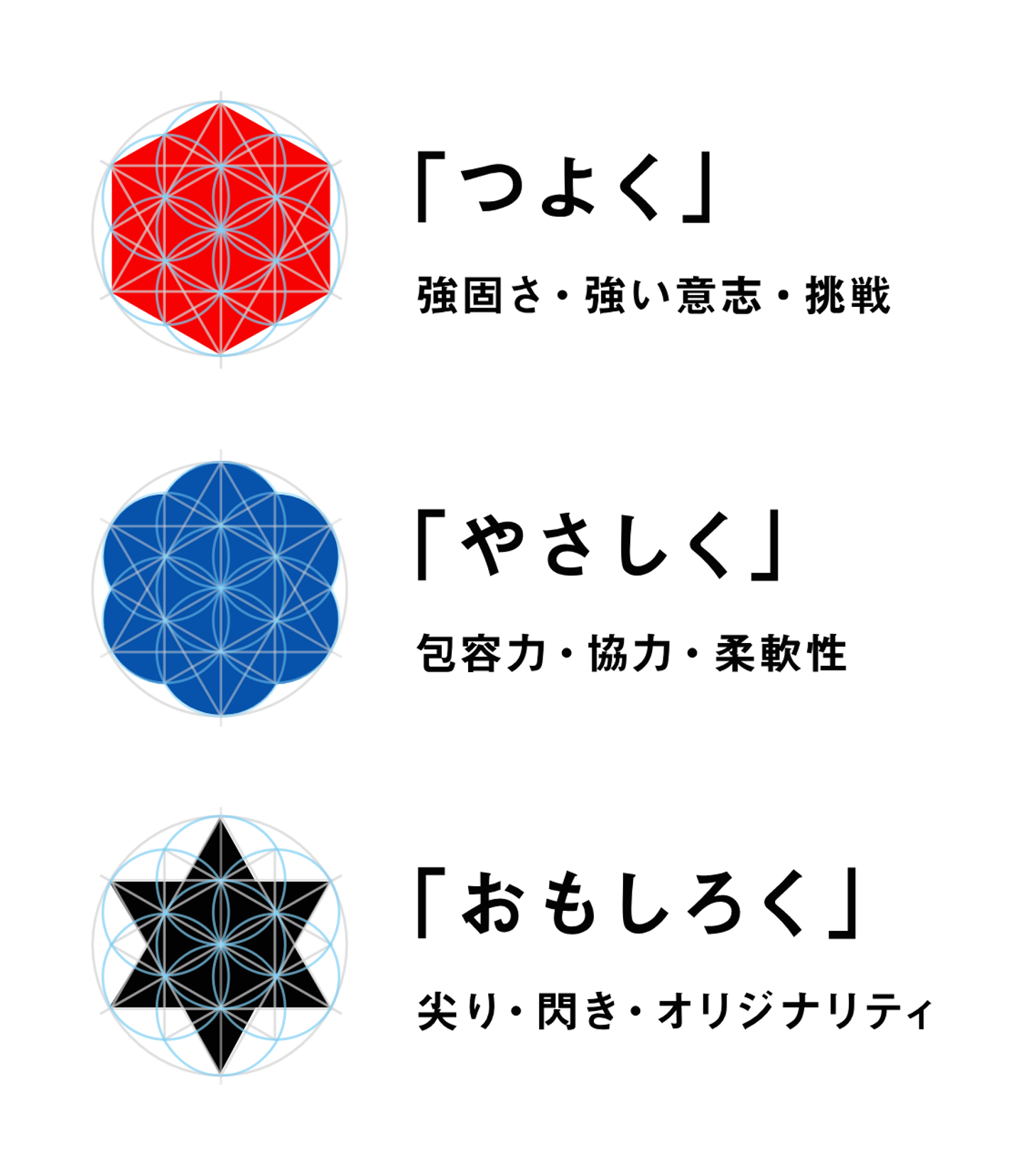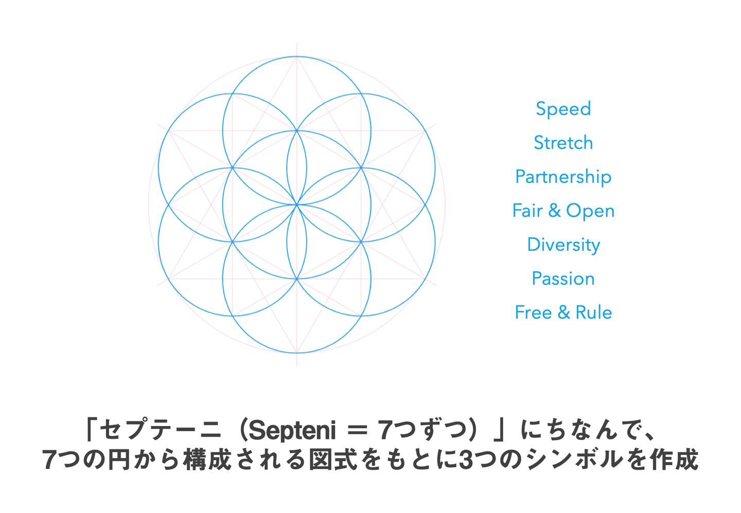 そしてシンボルマークは、「セプテーニ(Septeni)=7つずつ」にちなんで、7つの円から構成される図式をもとに「つよく、やさしく、おもしろく。」の3つの表現を作成することにしました。