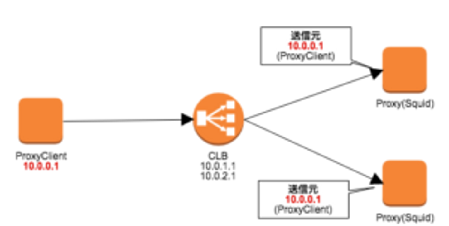 クライアントからの通信をCLBを経由してサーバにTCPで分散する際に、クライアントのIPアドレスがCLBのIPアドレスに書き換えられます。