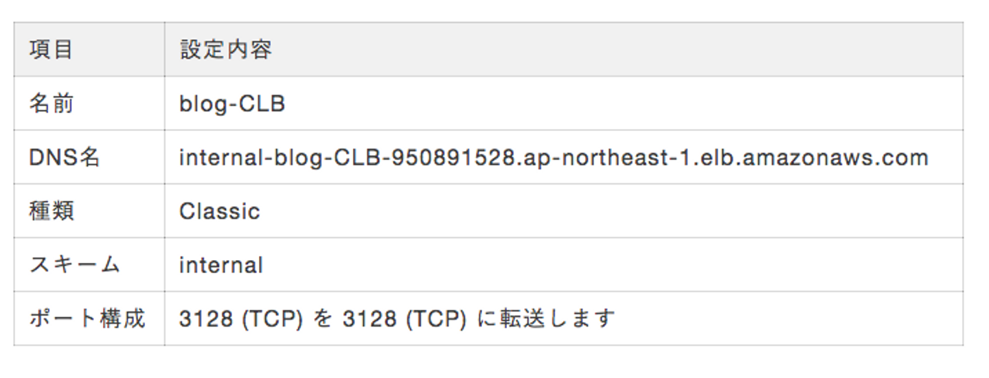 aws elb set-load-balancer-policies-for-backend-server --load-balancer-name blog-CLB --instance-port 3128 --policy-names my-ProxyProtocol-policyポリシーが適用されていることを確認