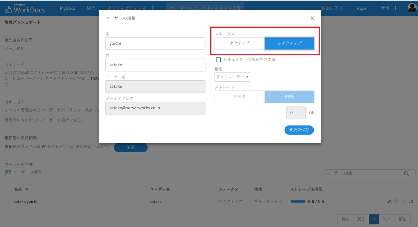 上の画像にある通り、WorkSpacesを削除した後はあわせてWorkDocsの管理画面から対象ユーザを「非アクティブ」に変更しましょう。これでWorkDocs側の利用料金の発生を防ぐことが可能です。