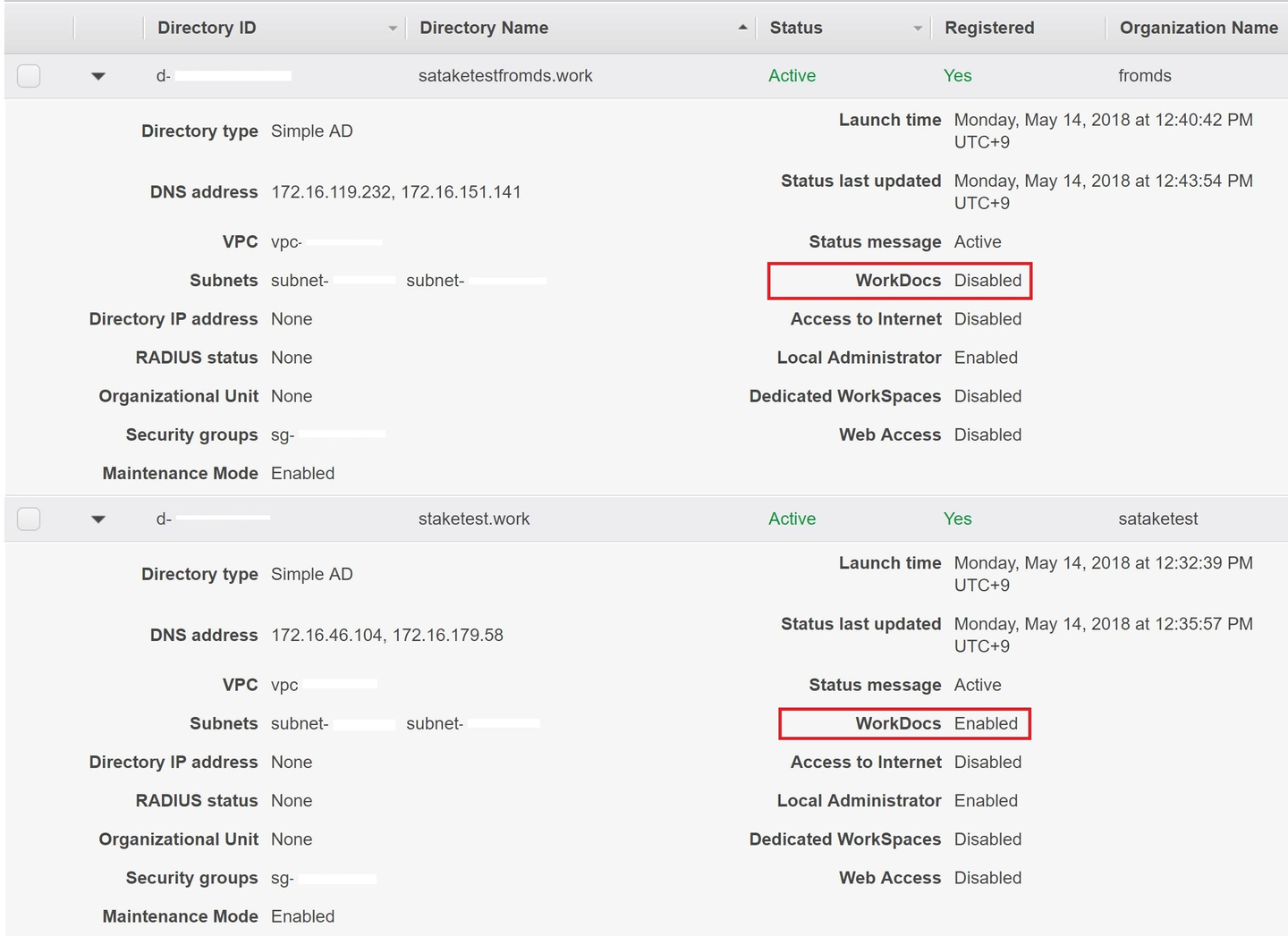 今度は、WorkSpacesのコンソールからDirectoriesの画面で比較してみましょう。
