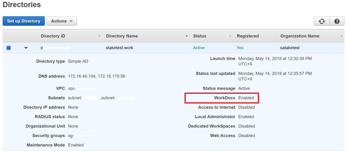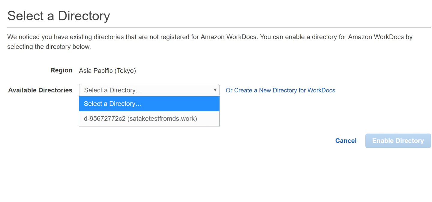 まず、上に記載しましたDirectory ServiceのRegister時に「No」を選択します。もしくは、2015年6月以前は東京リージョンにWorkDocsがサービス展開されていませんため、古いDirectory Serviceではそもそもこの選択肢は存在せず、強制的にNoになっているかと想定されます。