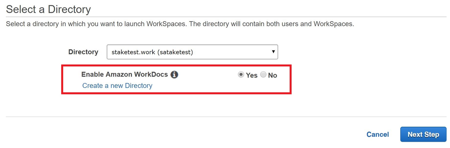 この状態で、WorkDocsのコンソールより、既存のWorkSpacesで利用しているDirectory Serviceを対象としてWorkDocsを構築します。