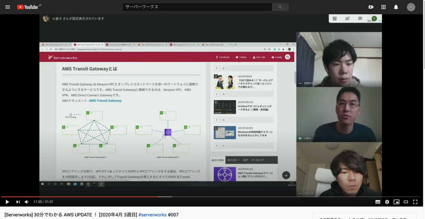 Youtubeで「週間AWS Update」というライブ配信や、過去事例や、はじめてのAWSといった動画コンテンツ等を配信しているチャンネルがあります。ライブの配信時は東京オフィス ANNEXに集まってお送りしていたのですが、ここでもフルリモート配信に切り替わりました。