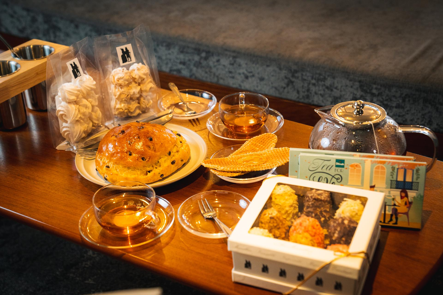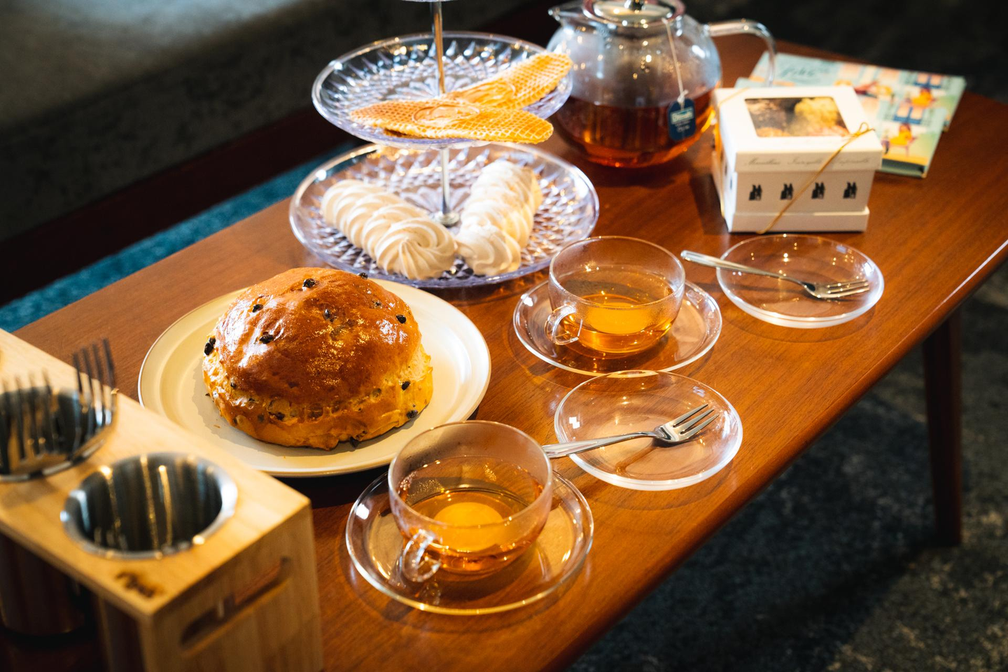 ご利用人数に合わせて心置きなくお菓子を堪能できるよう、2タイプのセットをご用意しました。客室にはティーセットやカトラリーを揃えており、お手軽にアフタヌーンティーを楽しむことが可能です。お供の茶葉はAux Merveilleux de Fred(オーメルヴェイユ・ドゥ・フレッド) が選んだDelmahを使用。