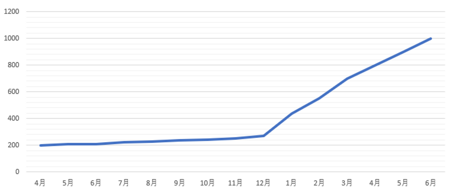 フォロワーも徐々に増え始めて、この1年間で200人→1000人にまで右肩上がりに増加しました。大雑把ですが、グラフに表すと以下の通りです。