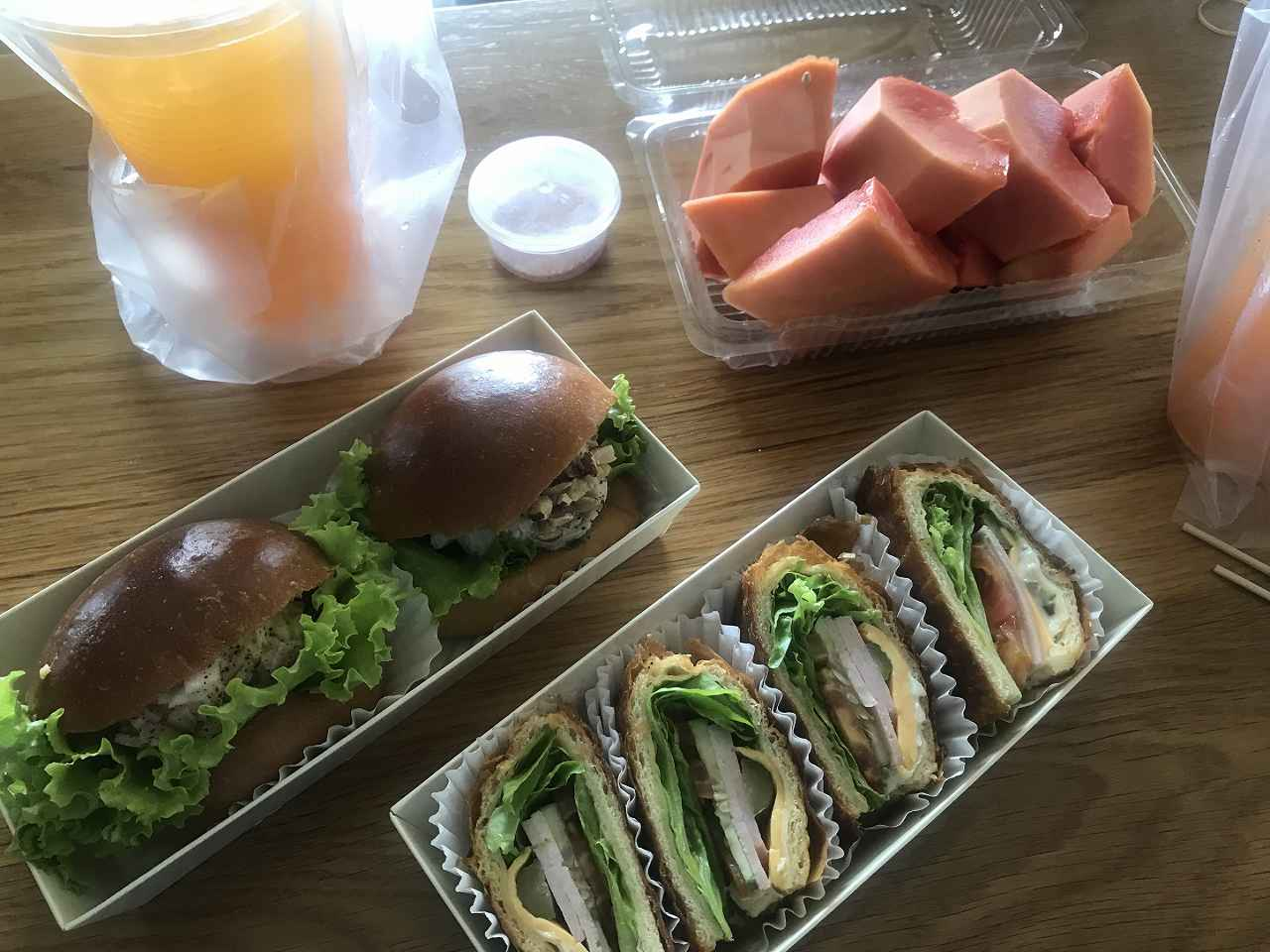 今日はあまりお腹が空いていないとのことで、オフィス地下のベーカリーショップで購入したサンドイッチと、路上販売の生絞りジュースとフルーツ(パパイヤ)でヘルシーランチ。