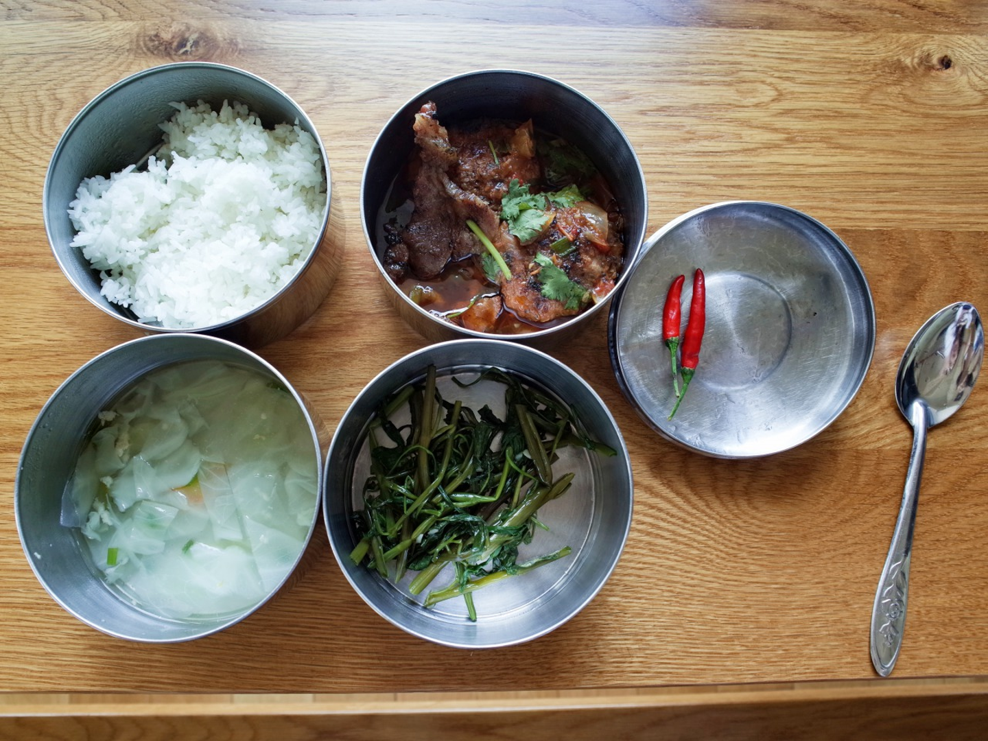 4段重ねの内訳は大体、①御飯 ②肉や魚のおかず ③野菜のおかず ④スープ です。