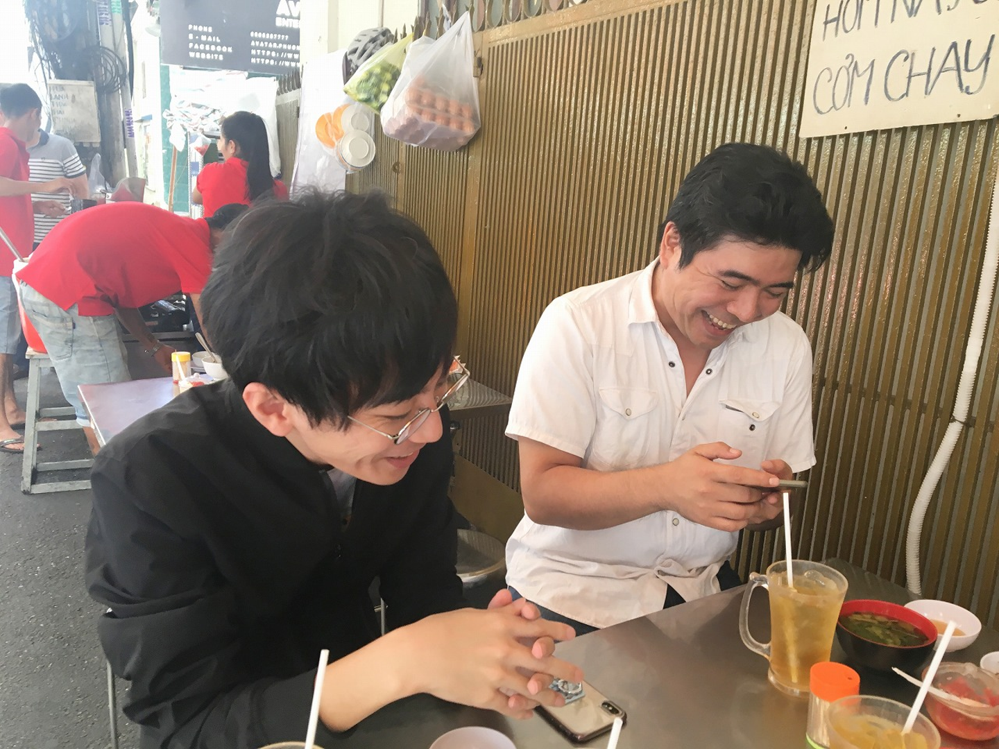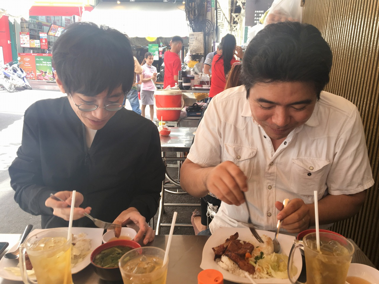 (COM TAMを食べるKENとZONO。KEN曰く、ここのCOM TAMはホーチミンで3本の指に入る美味しさだそう。私も食しましたが、確かにお肉は分厚く、かつ柔らくて絶品でした!)