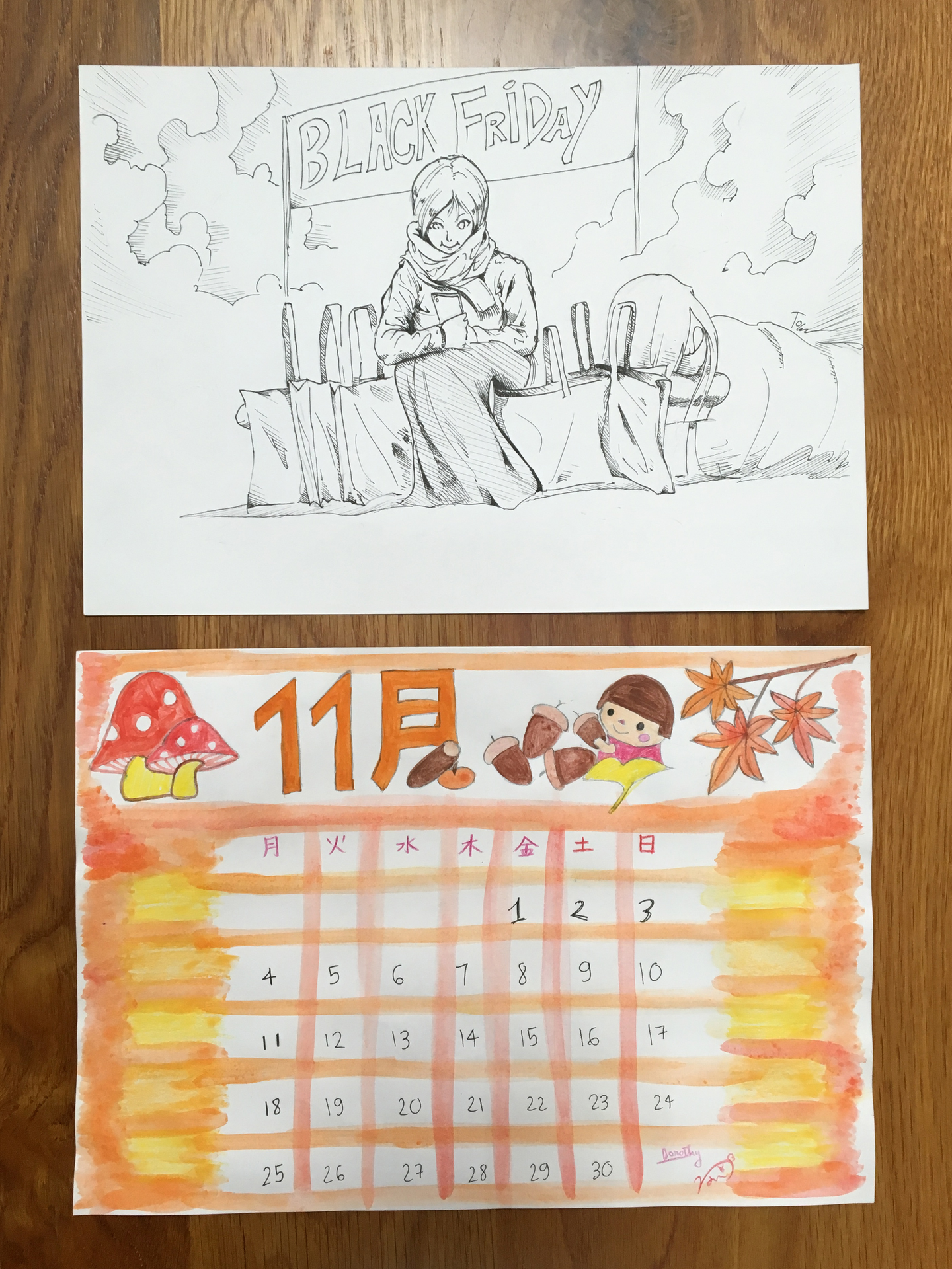 白黒のペン画が得意なTomの絵にDorothyが日付部分を描いてくれました。
