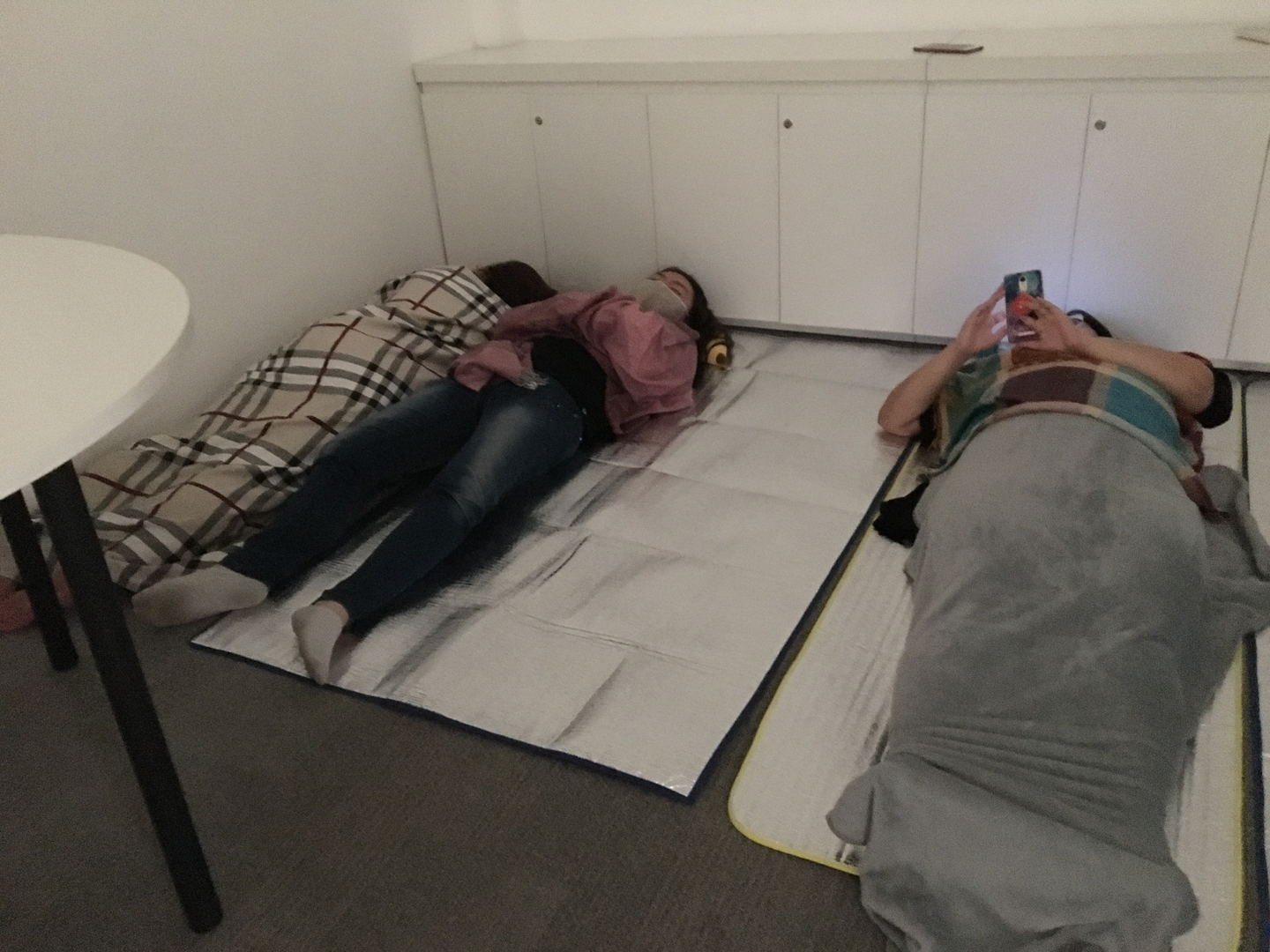 幸いなことに我が社は会議室など個室もフロアごとにたくさんあるので、空いた部屋を使ってレジャーシートや敷く用とかける用の二枚のブランケットを所持しているメンバーも少なくないです。