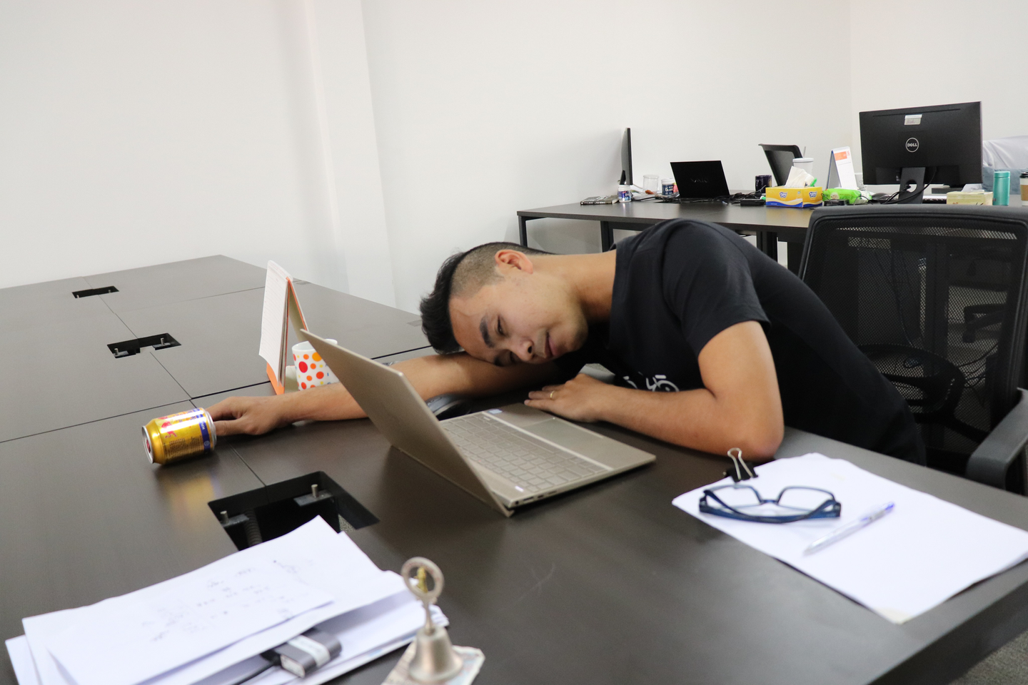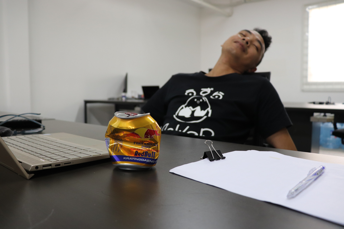 虚ろな目、空になったレッドブル、もうダメ無理…って顔。