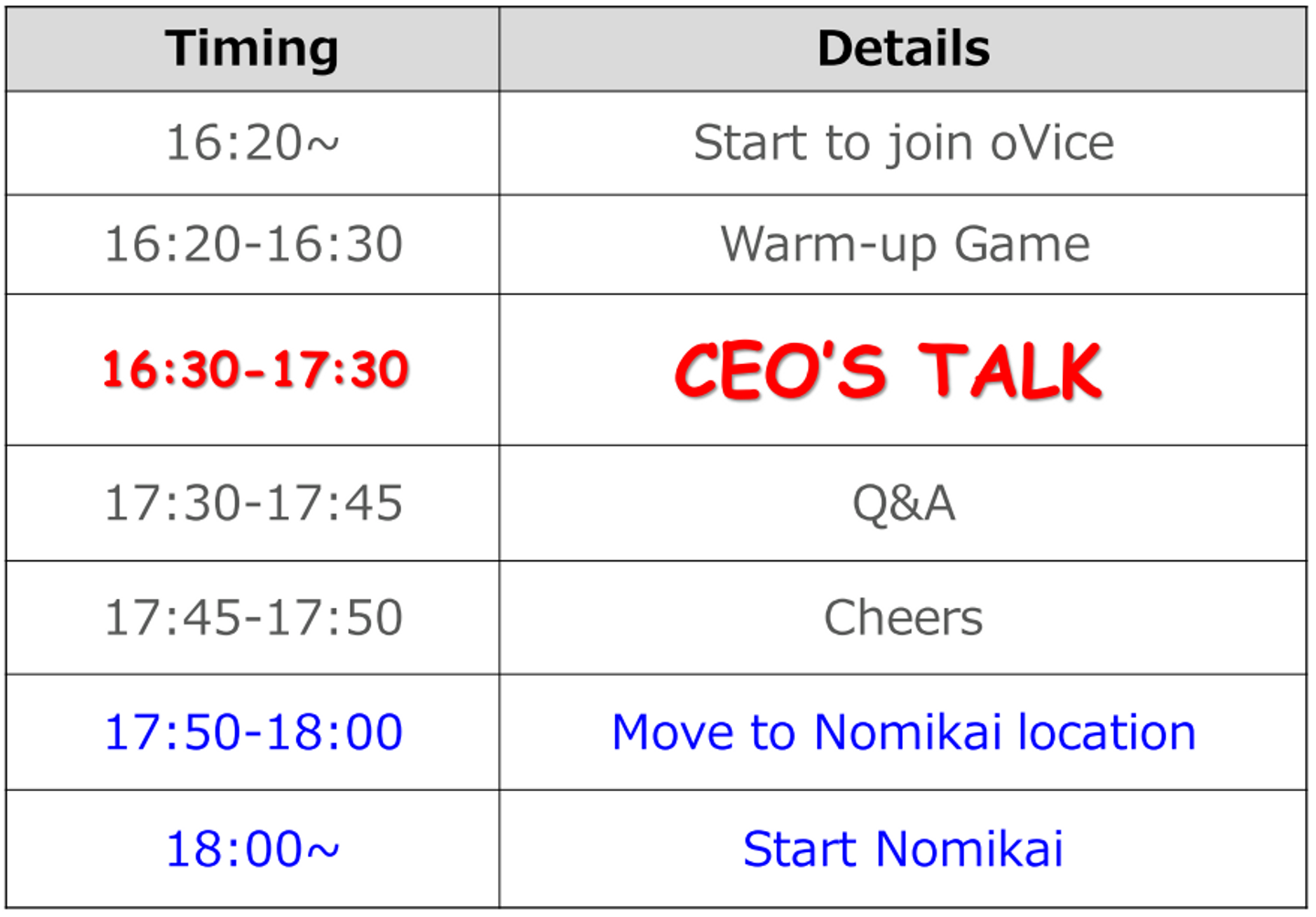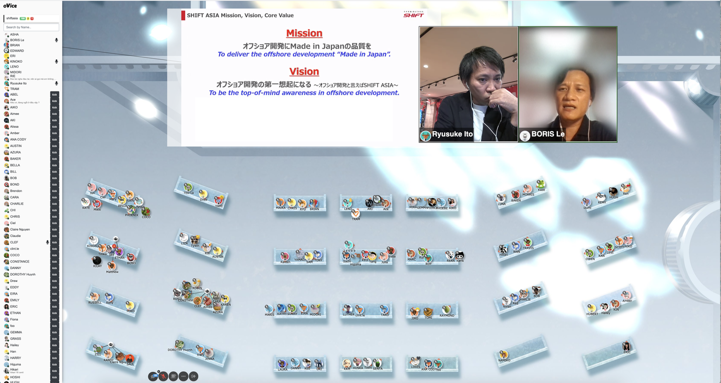 因みに、上の画像はCEO伊藤によるプレゼン「CEO's TALK」の時の一コマです。CEOの右隣に写っているのはベトナム語の通訳を務めた開発部門ダイレクターのBORISです。このように「oVice」では自分のアバターをバーチャル空間上の好きな席に座らせて話を聞くこともできるので、通常のオンライン会議よりも臨場感がある雰囲気が味わえるのが特徴です。