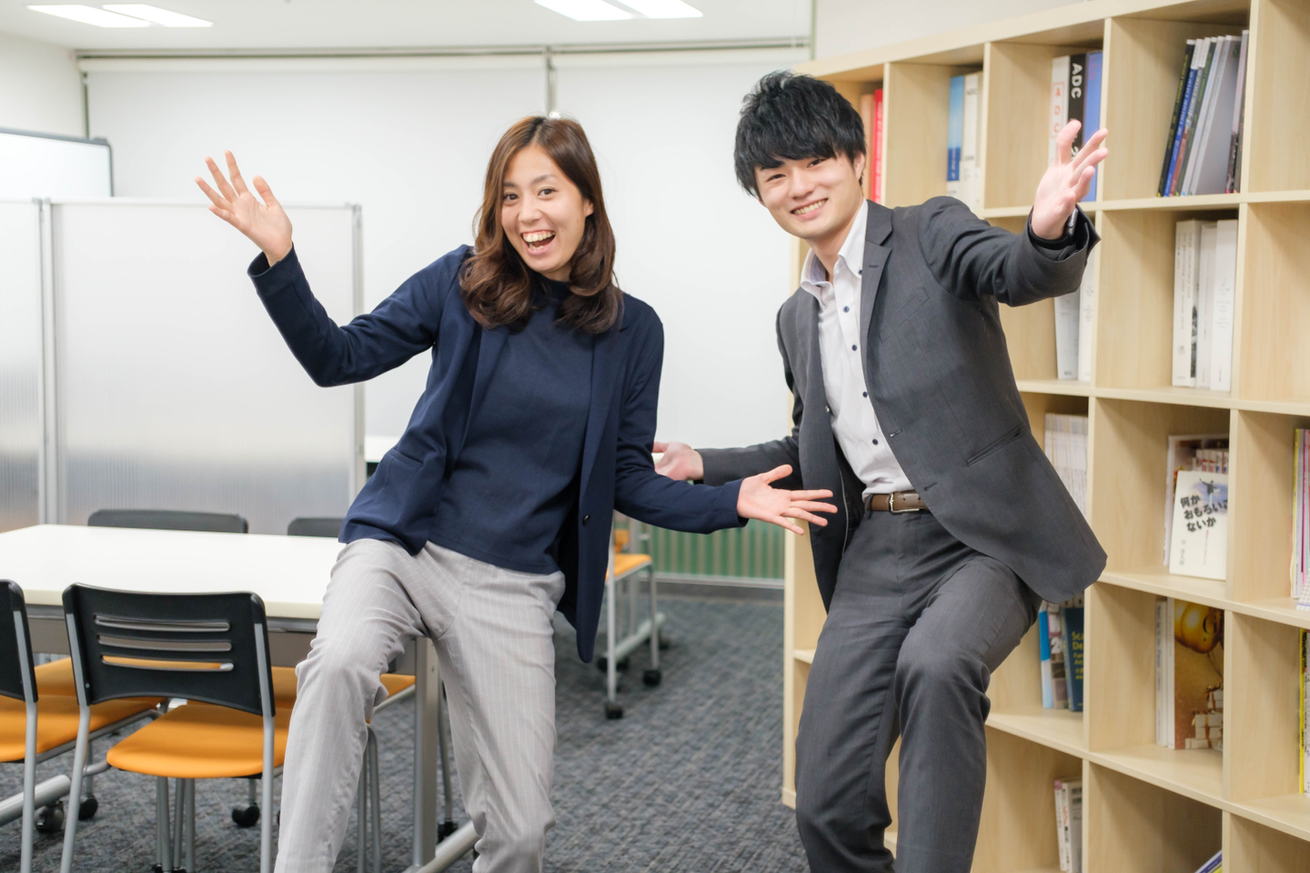 打ち合わせスペース。大阪っぽいポーズと共に。