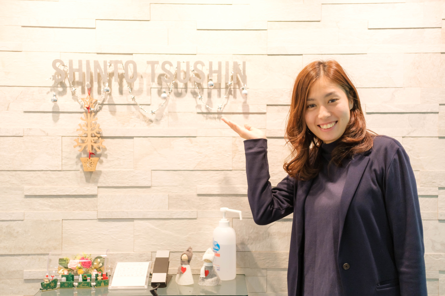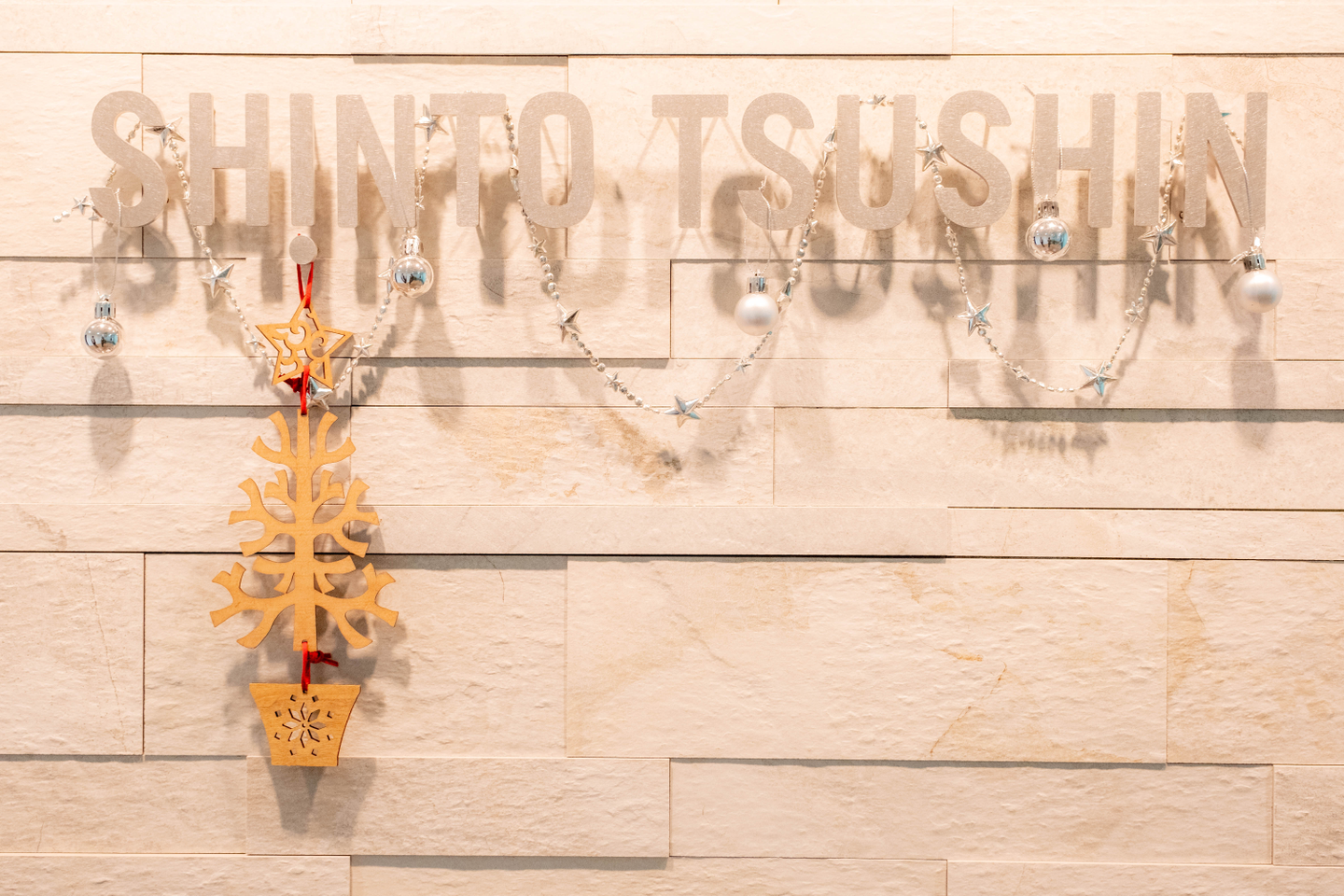受付のSHINTO TSUSHINのロゴはクリスマス仕様です。Kawaii.