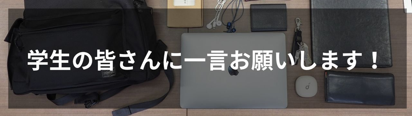 これまでイケミヤさんのカバンの中身、「What’s in your bag?」を見てきましたが、最後にこの記事をご覧になっている学生の皆さまへメッセージを頂きました。
