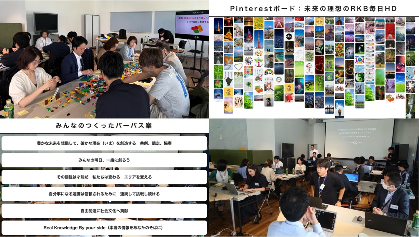 そこから、LEGO® SERIOUS PLAY®を用いてグループの未来を具体化するワークショップ、ひとりひとりがスローガンを言語化するワークショップ、グループ全員が参加するPinterestボードを使った直感的なアンケート、そしてグループ経営陣へのデプスインタビューなどなど、様々なアプローチを通じて、言葉をつくるためのヒントを収集していきました。
