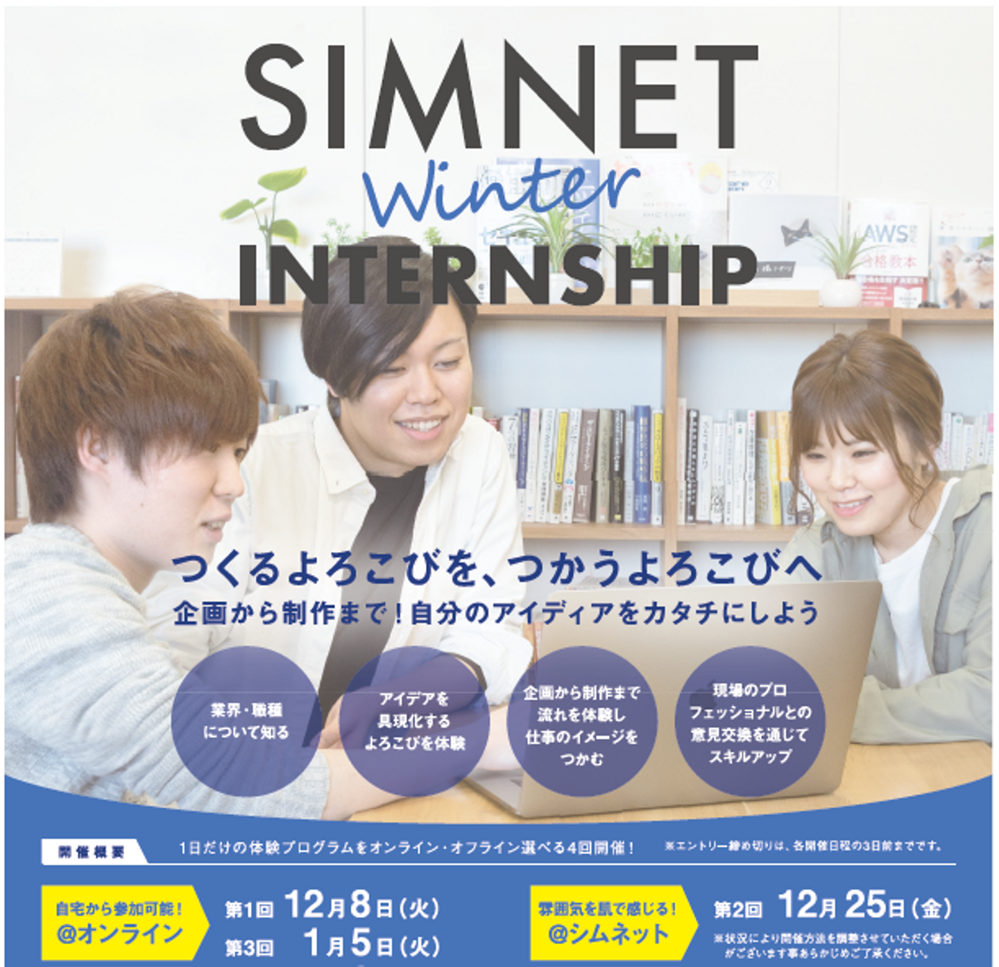夏は2週間かけて企画~制作までをじっくり経験できるイベントでしたが、今回は1日体験インターンシップとなります。対象者は文理不問。サービスづくりに興味のある方や、企画から制作までの流れを体験したい方、シムネットの事業内容や会社自体に興味を持ってくださった方、など様々な方にご予約・ご参加いただいております。