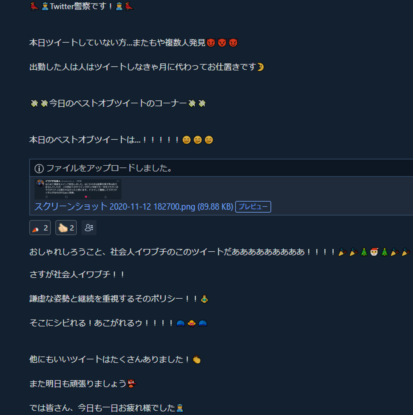SNS活用のチャットで、1日1回その日一番良かったツイート(独断)を表彰しています。