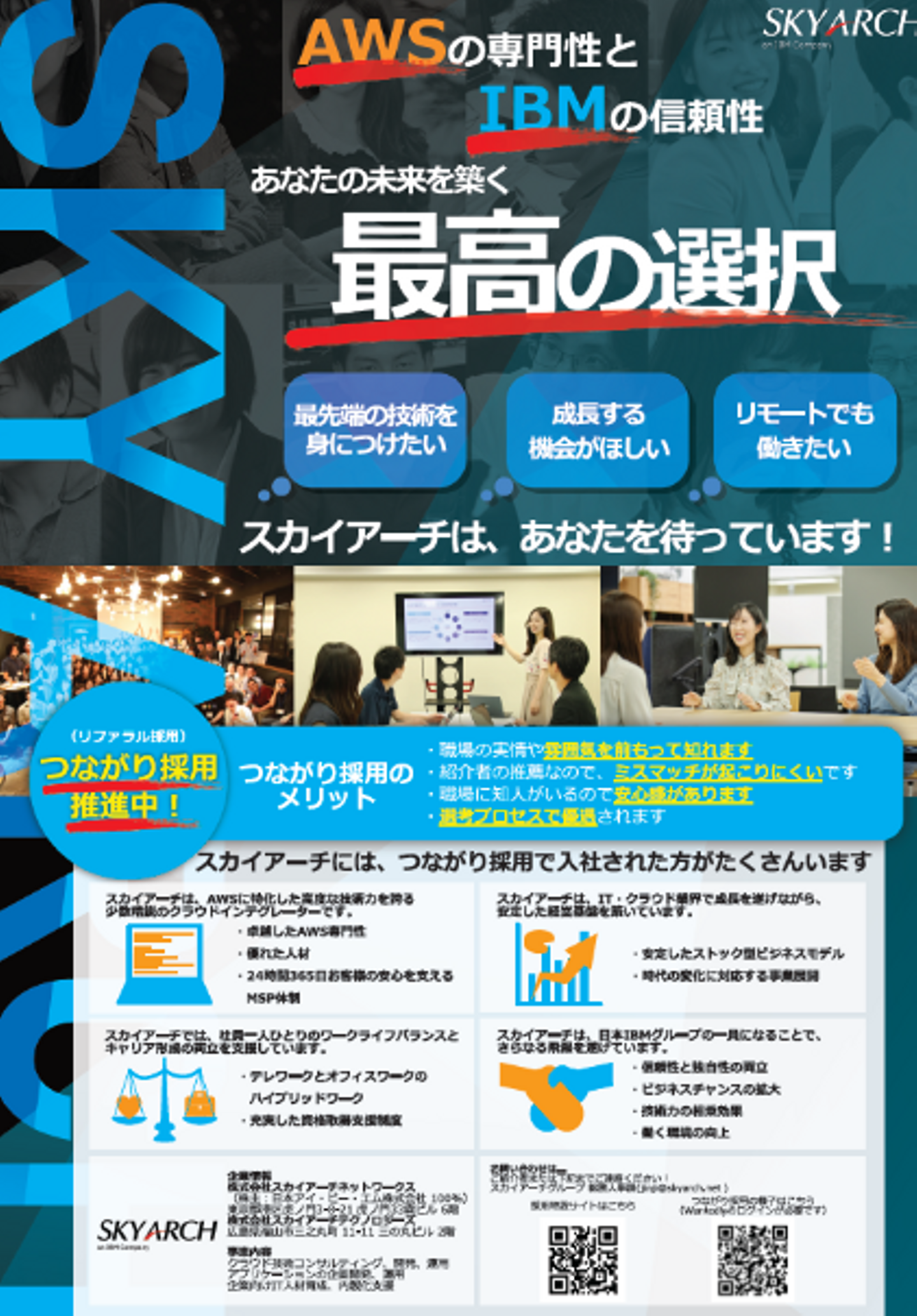 スカイアーチグループ(スカイアーチネットワークス及びスカイアーチテクノロジーズ)は、優秀な人材の確保と社員の皆様の積極的な参加を促進するため、リファラル採用制度を大幅に強化いたしました。さらに、この取り組みを効果的に推進するため、独自のリファラル採用チラシを作成し、社内外への周知を図っております。