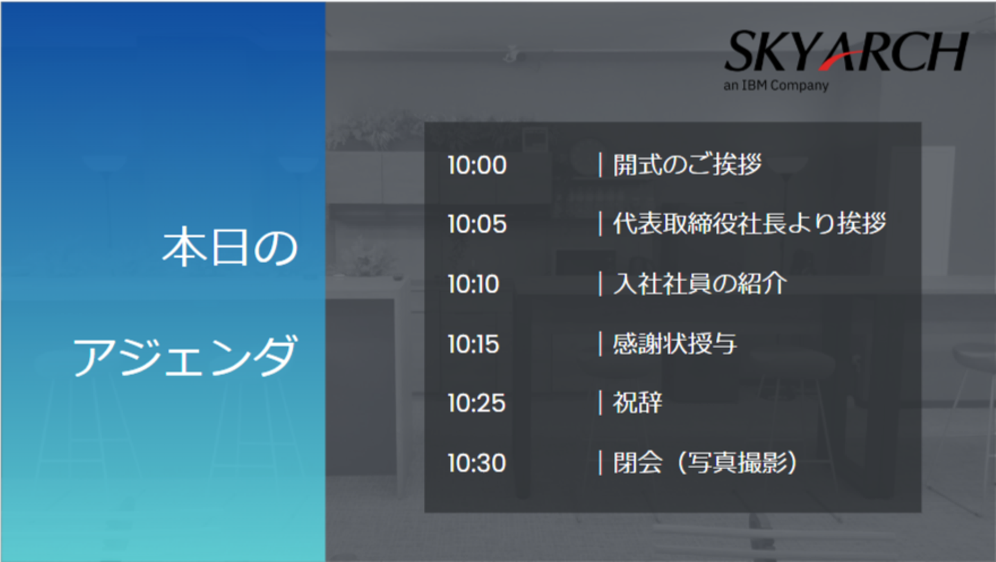 こんにちは、スカイアーチネットワークス採用担当 結城です。本日はスカイアーチテクノロジーズにて入社式が行われたのでご紹介させていただきます!!