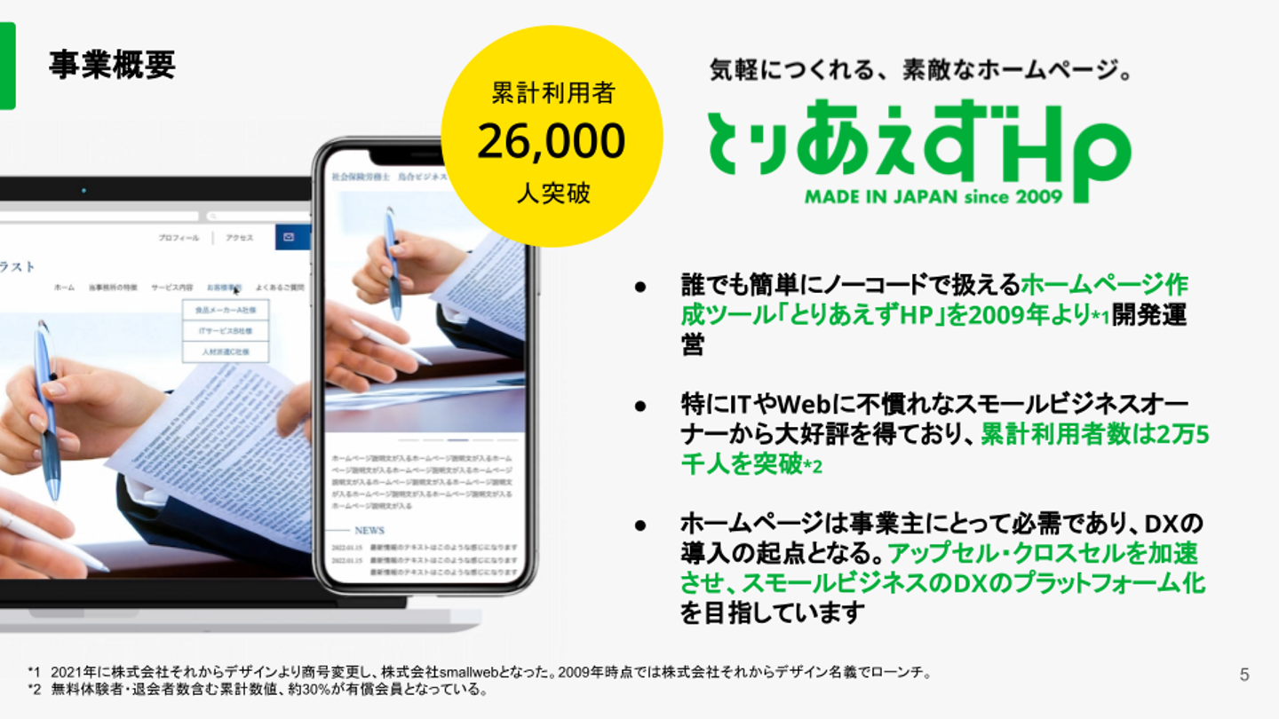 株式会社smallweb(スモール・ウェブ)という名の通り、私たちは小さなホームページをコードを書かずに素早く作成できるSaaSプロダクト「とりあえずHP」の開発と運営を行っている企業です。