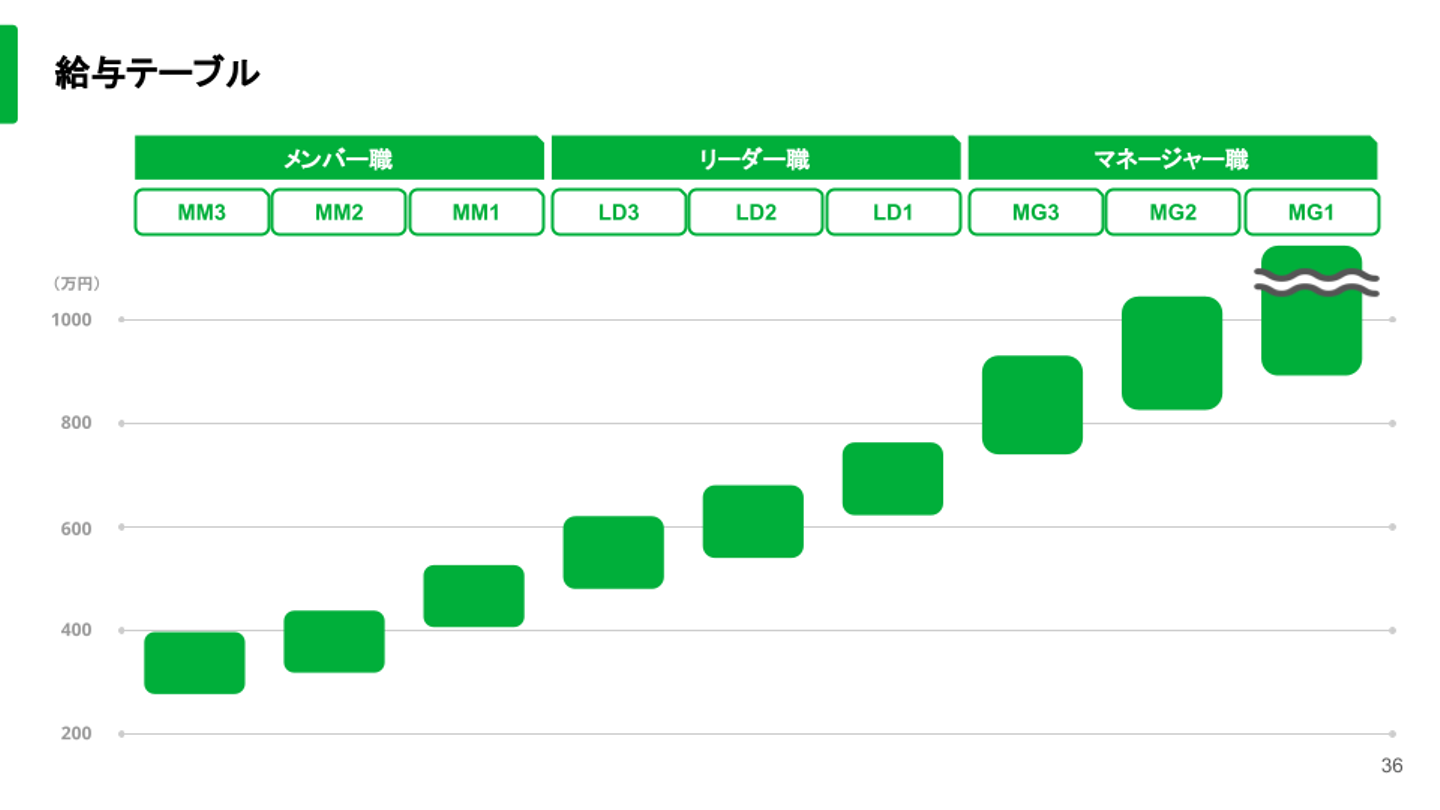 当社では、役割等級制度に基づいた給与制度を採用しています。役割が上がるに従い、昇給する仕組みとなっており、メンバー職、リーダー職、マネージャー職のそれぞれにおいて、給与レンジが設定されています。昇給のタイミングは年2回であり、6月と12月に行われる面談において、役割の評価が行われます。その結果、昇給の機会が与えられることになります。