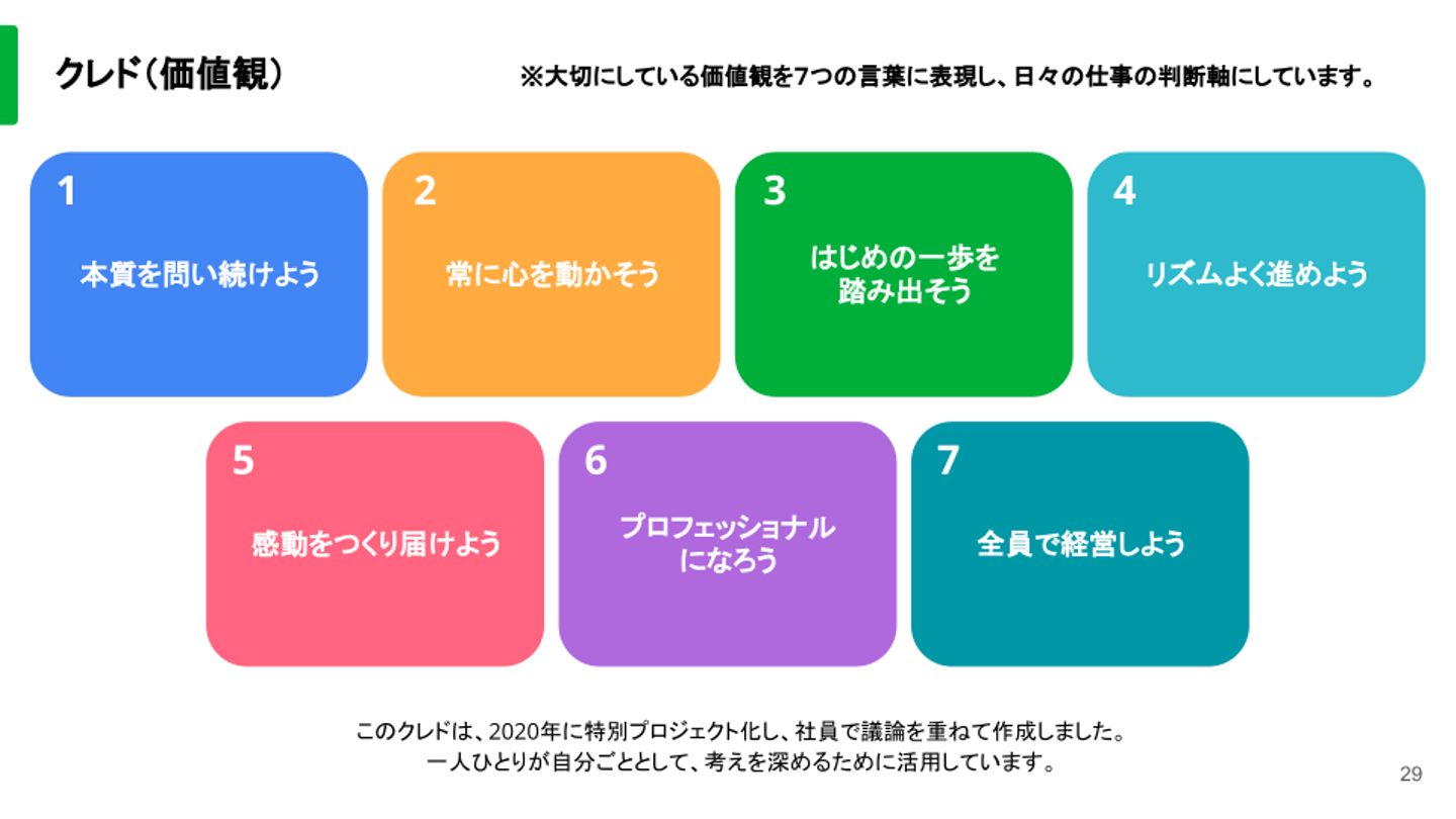 私たちが大事にする7つの価値観を言葉にし、毎日の業務での意思決定の基準として活用しています。このクレドは、社員同士で意見交換を行いながら作り上げました。それぞれのメンバーが、自分自身の仕事に関連させながら、役割を深く理解するために使っています。