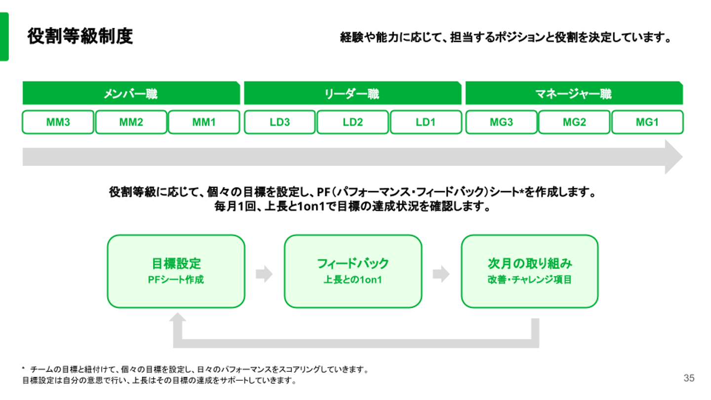 当社では、人事制度として「役割等級制度」を採用しており、経験や能力に応じて担当するポジションや役割を決定しています。役割等級に応じて個々の目標を設定し、PFシート(パフォーマンス・フィードバック)シート*を作成します。上司との1on1ミーティングでは、毎月1回目標達成状況を確認しています。