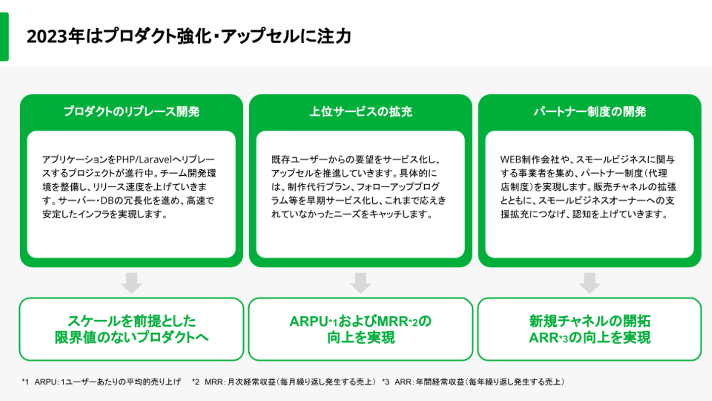2023年は、「とりあえずHP」という既存プロダクトのパフォーマンスを最大限に引き出すことに焦点を当てます。現在、マーケティングとカスタマーサクセスの連携を強化し、ナーチャリングサービスの企画開発にも積極的に取り組んでおり、成果が次第に現れています。さらに、使い勝手を向上させ、高速稼働を実現し、エンジニアチームの機能開発を円滑化するために開発インフラを全面的に刷新する計画も進めています。