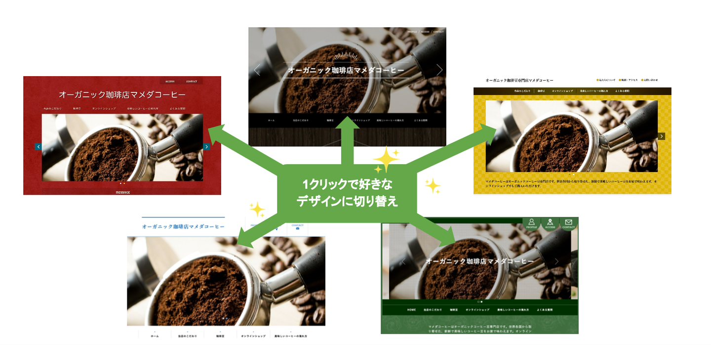 次に、240種類以上のデザインテンプレートが用意されており、すべてワンタッチで着せ替えが可能です。データ投稿機能とテンプレートによる表示が分離されているため、作成途中でも作成後でも、デザインをボタン一つで切り替えることができ、表示や動作が崩れません。国内の小規模事業者の業種別デザイン傾向を分析し、デザインを取り揃えているため、適切なデザインを選び、文字や写真を投稿するだけで、すぐにホームページを公開できます。