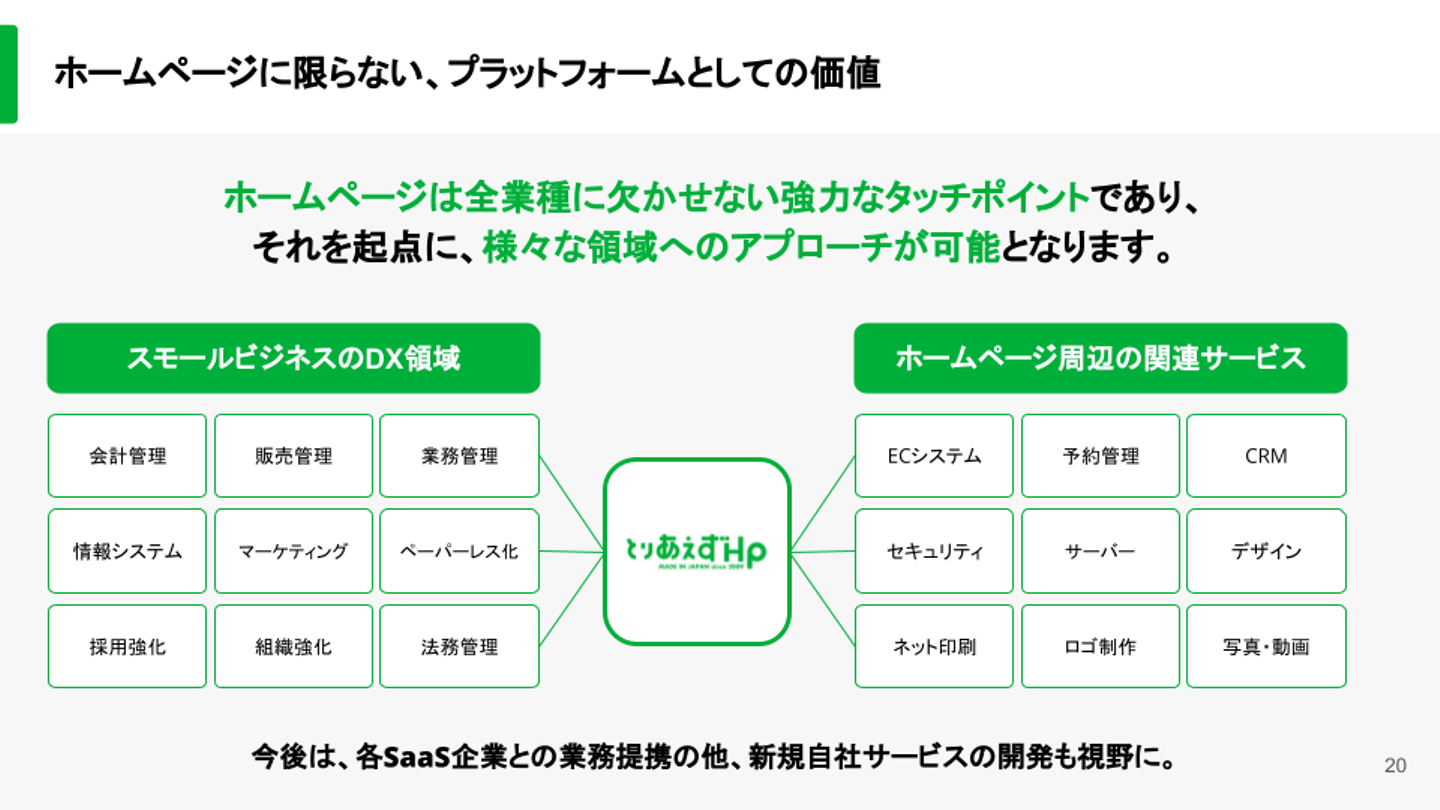 当社は、現在の主力事業である「とりあえずHP」を拡大し、新規事業の開発や他のSaaS企業との業務提携を通じて、スモールビジネスのDX領域で大きな存在感を持つ会社を目指しています。