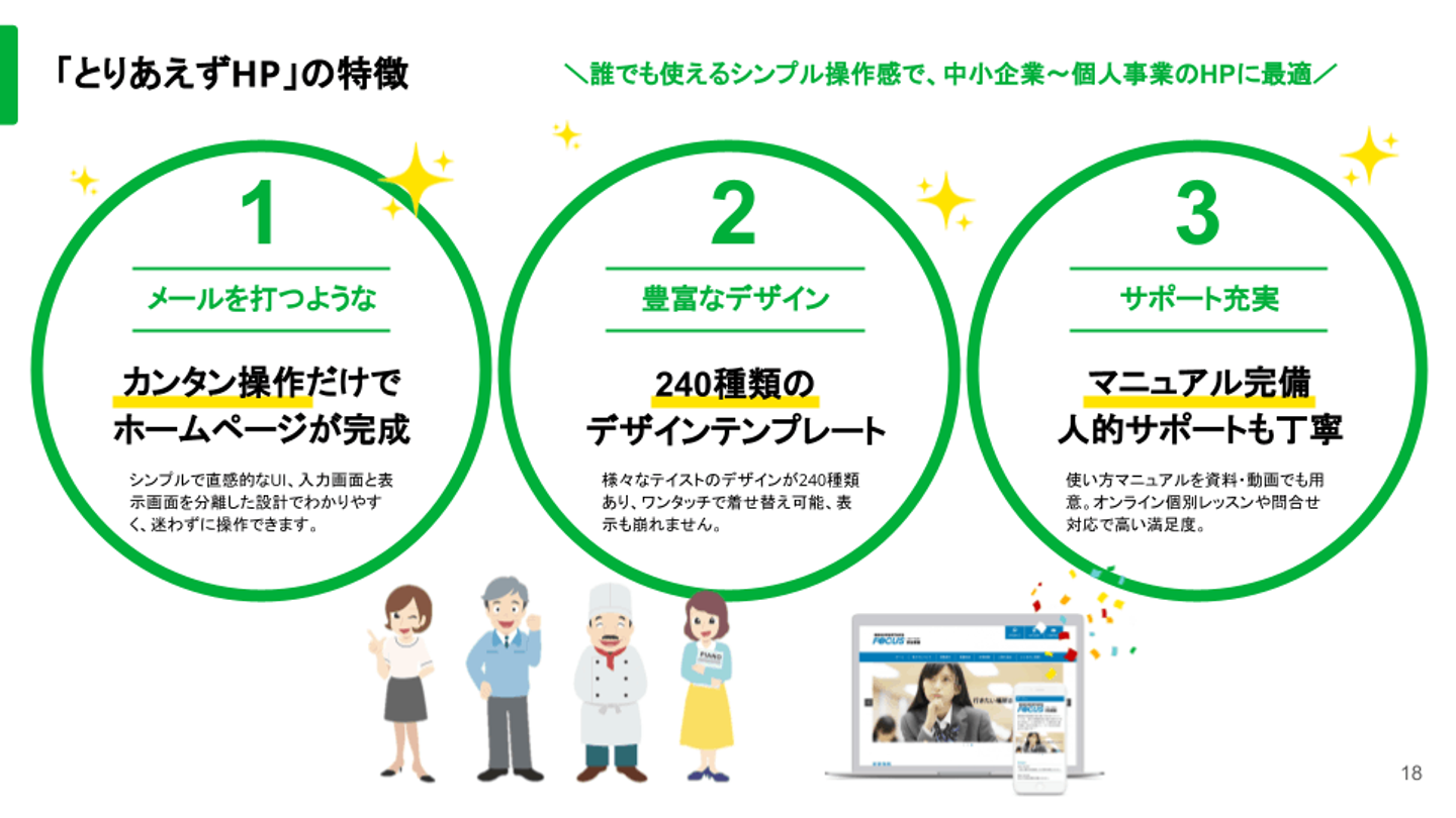 私たちの会社は、小規模ビジネス向けのWebサービスを開発する専門企業です。簡単に自分でホームページを作成できる「とりあえずHP」というプロダクトを展開し、SaaS分野の企業として位置づけられています。