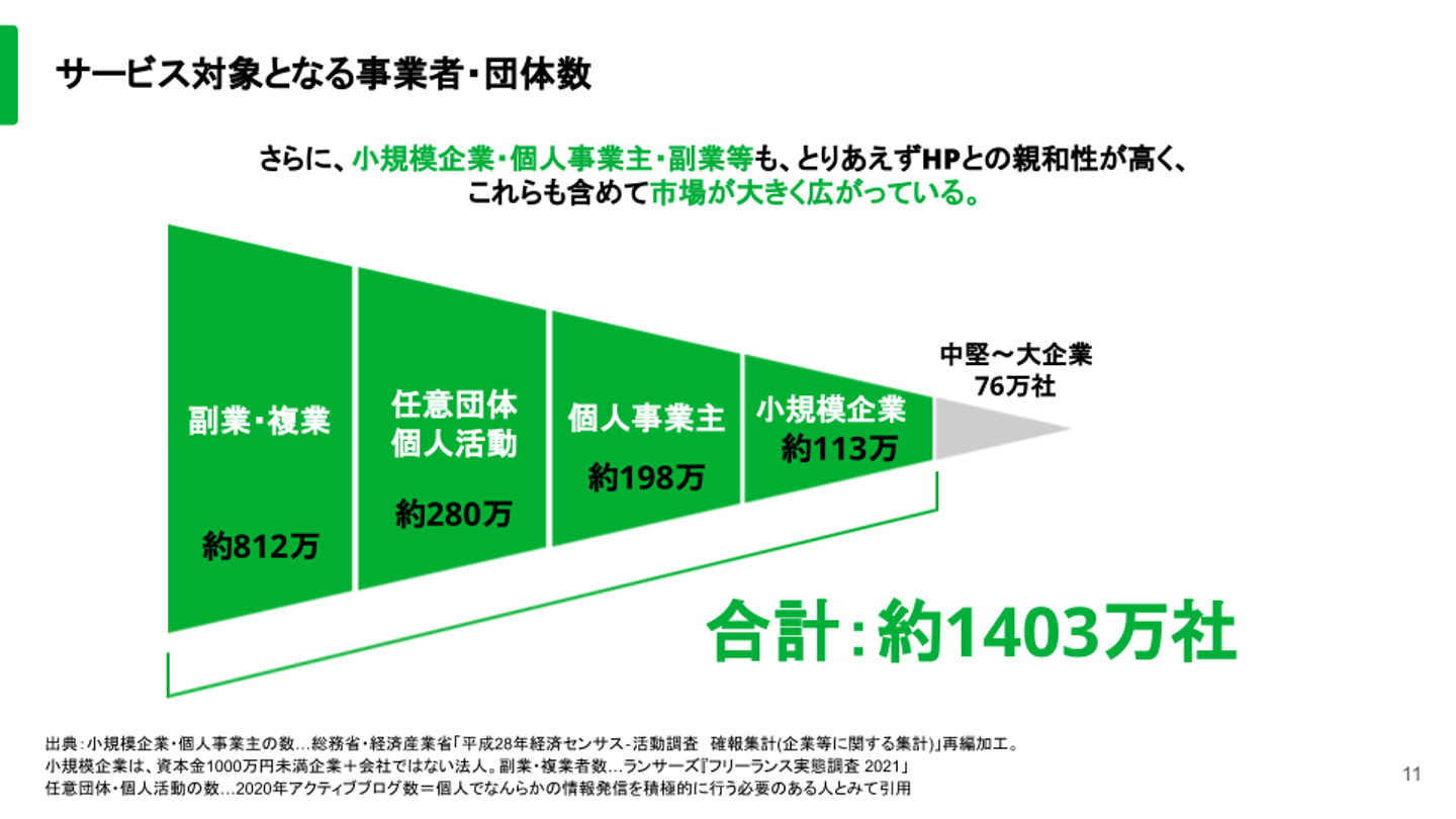 「とりあえずHP」のユーザーは、中小企業に限らず、従業員数が1~5名程度の小規模企業、個人事業主、副業や個人活動などのホームページとしても高い親和性があり、非常に大きな市場が存在すると言えます。概算で、国内だけでも約1,400万社の市場があると推定されています。