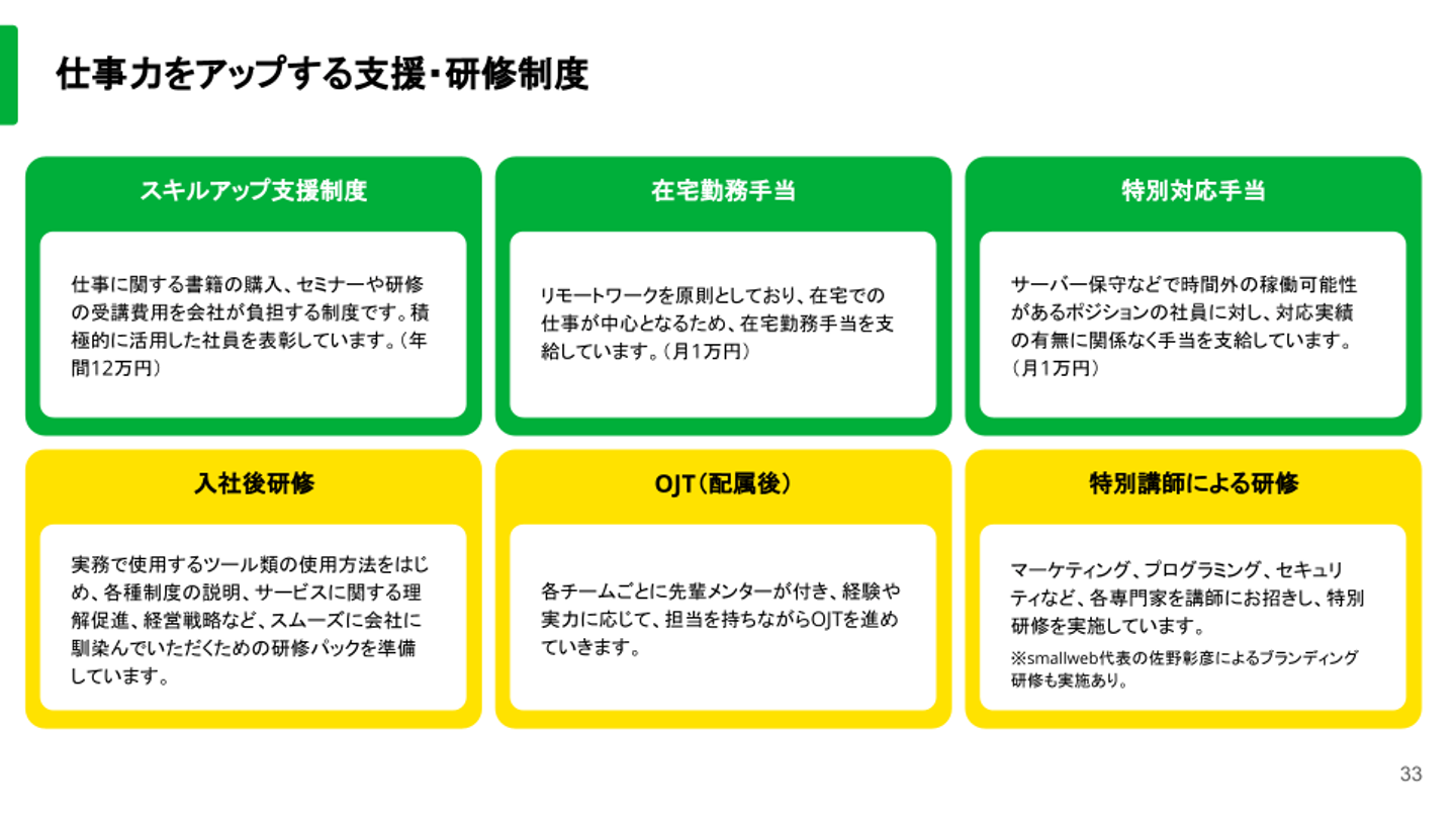当社では支援・研修制度を積極的に整備しています。「スキルアップ支援制度」という制度が特に評価が高く、職務に関連する書籍の購入やセミナー、研修の受講費用を会社が負担しています。この制度を活用して成果を上げた社員には、表彰を行い年間12万円が支給されます。