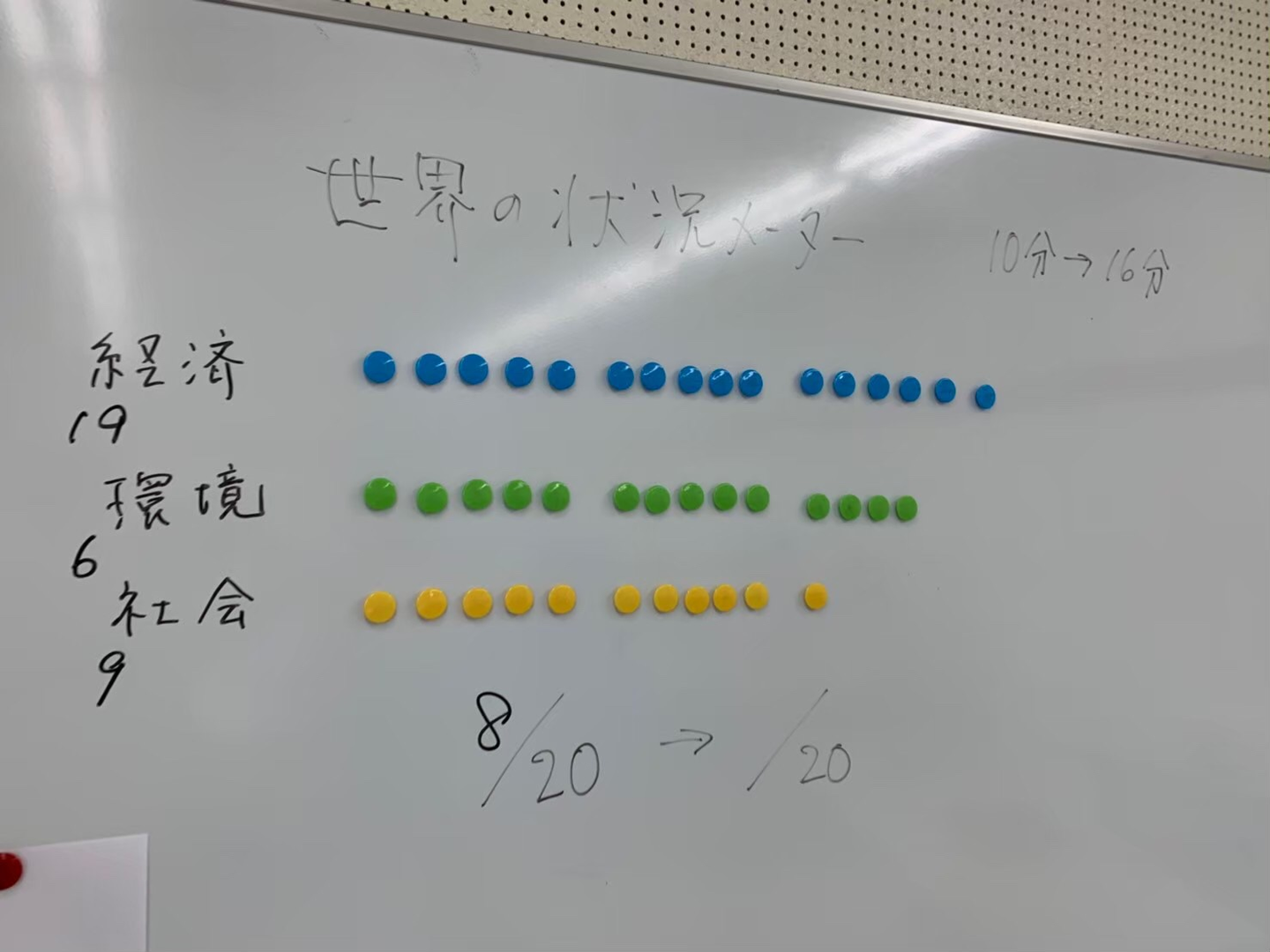 ゲームの目的はプレイヤー毎に配られる目標を個々が達成するというもので、たとえばお金を1200G以上集めるとか、環境のカードを6枚以上集めることができれば達成となります。加えて、ゲームの要素として世界の状況を表す経済・環境・社会の3つのパラメーターがあり、このパラメーターが3つともゲーム終了時点で均等かつ高い水準に到達しているようにプレーすることも目的です。