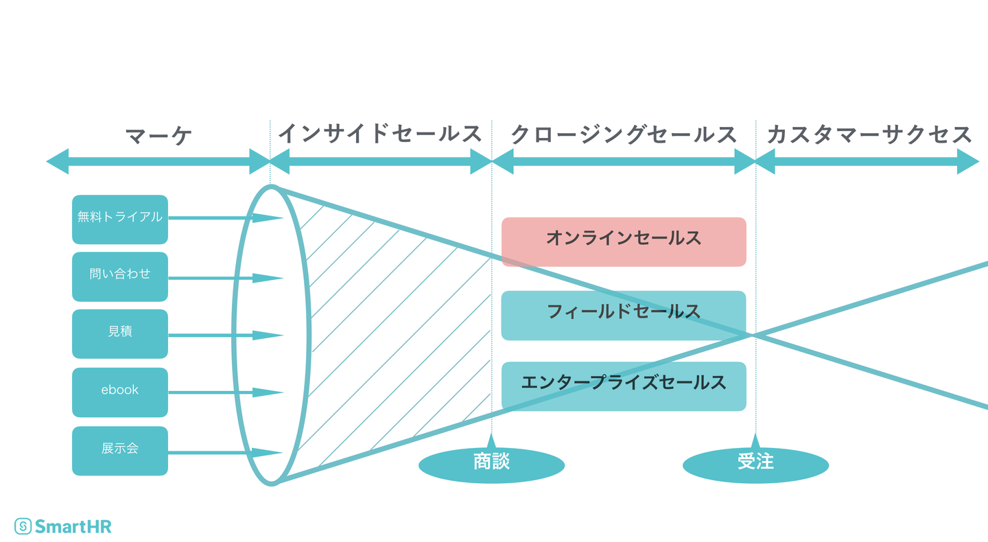 リードに対して、まずインサイドセールスが電話・メールでご連絡します。お問い合わせいただいた経緯・お客様が解決したい課題などをヒアリングし、SmartHRのプロダクトがフィットする場合は商談化、クロージングセールスにトスアップします。