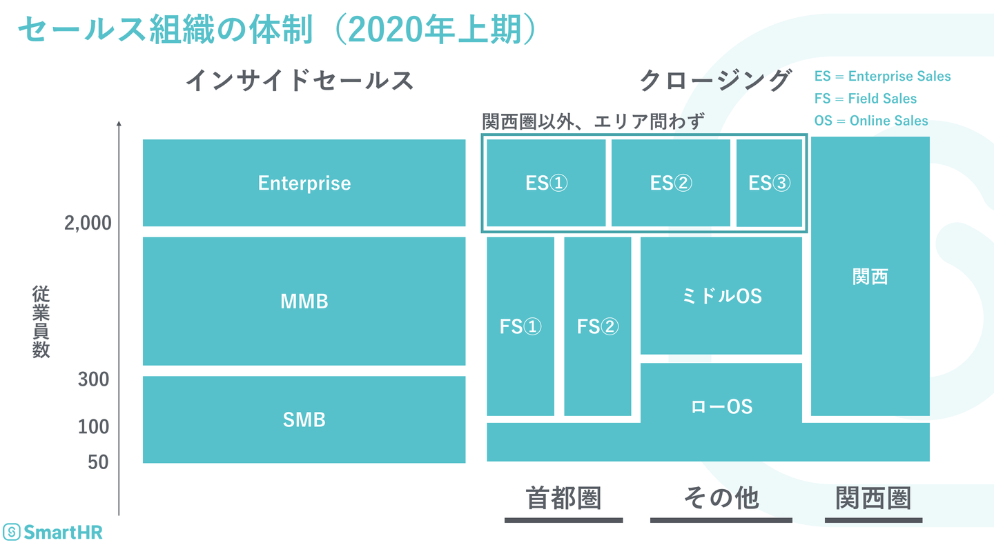 クロージングセールスは、企業規模や地域別で以下のように担当を分けています。