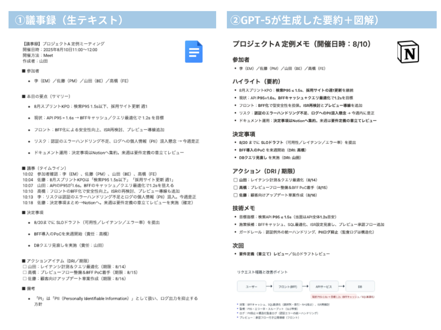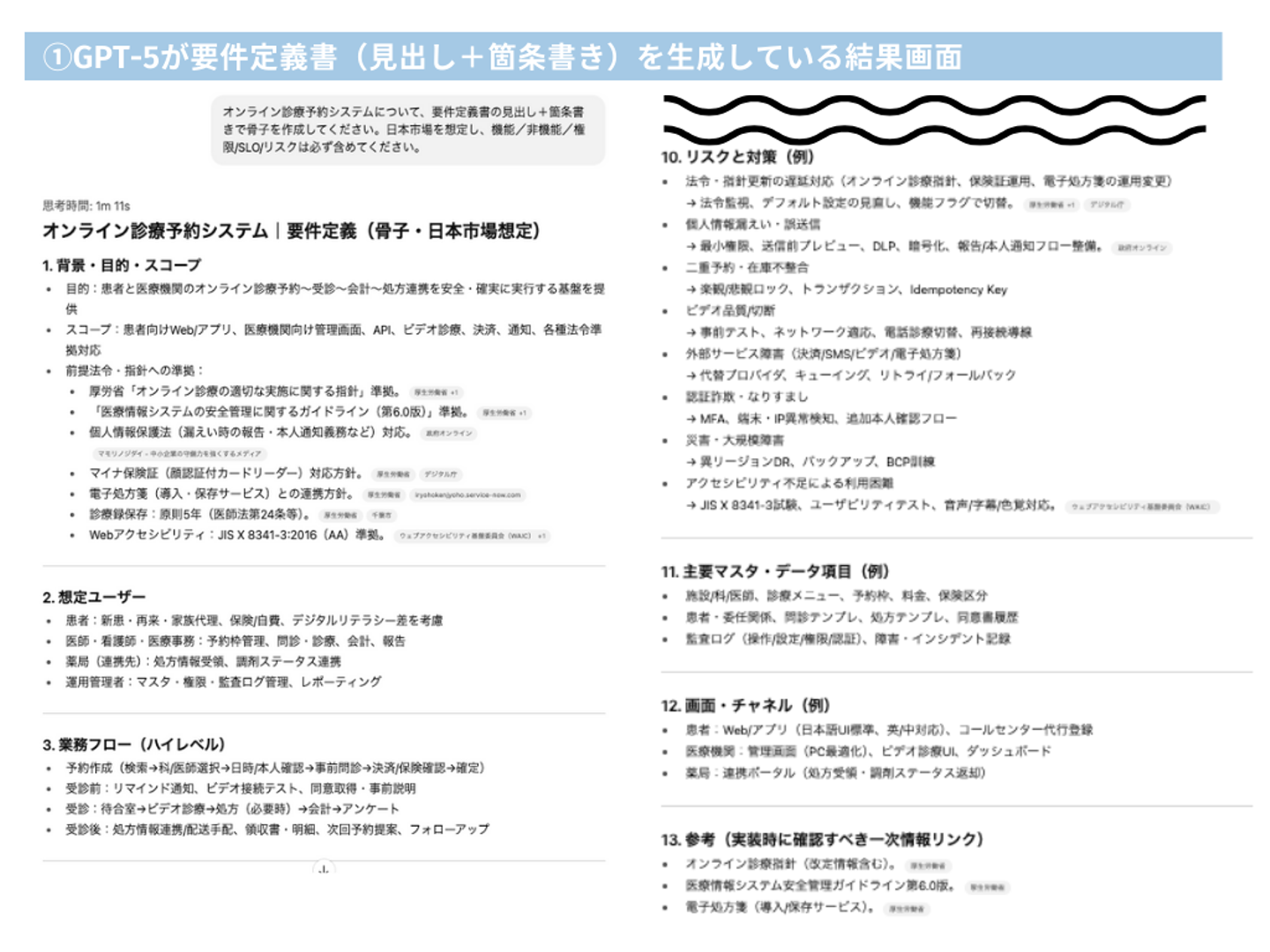 顧客からのヒアリングメモをGPT-5に投げると、構造化された要件定義書のドラフトが即生成されます。