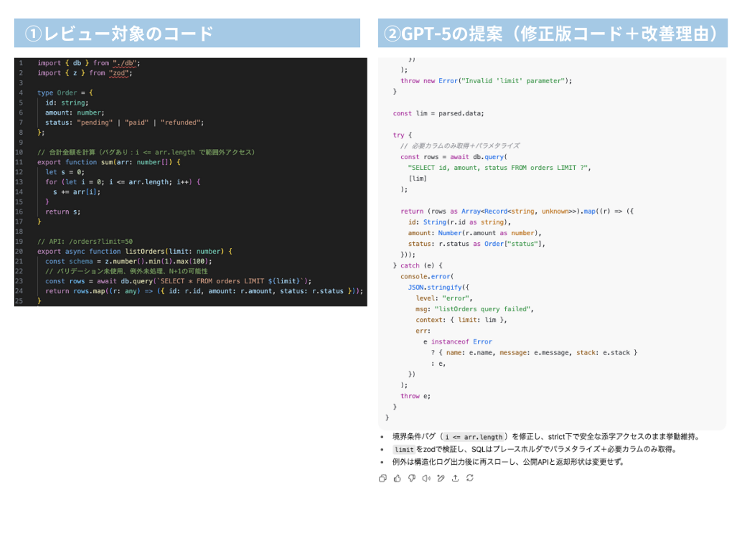 GPT-5は具体的な改善案+修正後コードを提示してくれます。
